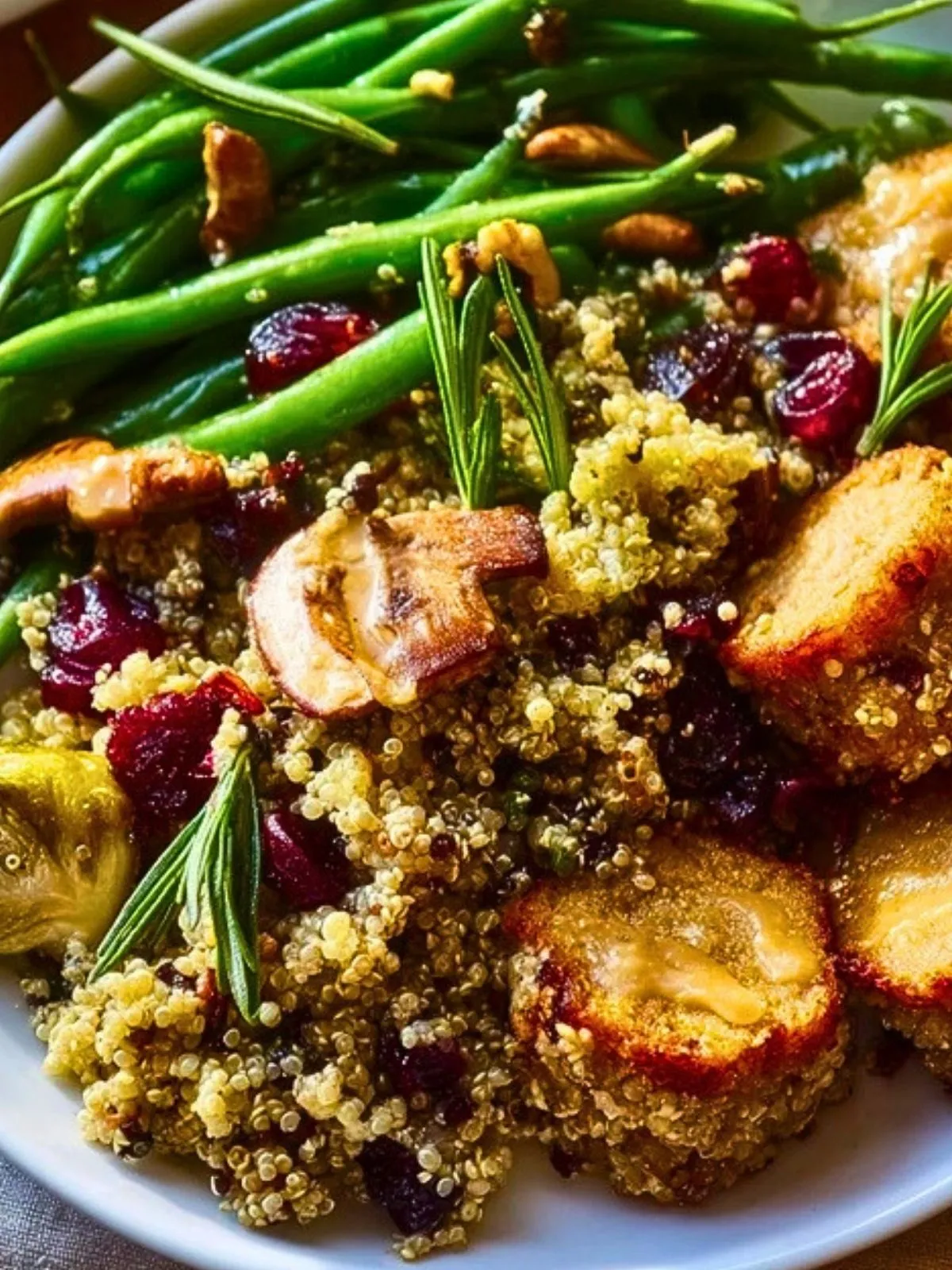 Une poêlée automnale de quinoa, haricots verts et champignons, gourmande, colorée et sans produits laitiers. Parfaite pour un accompagnement festif de Thanksgiving, elle marie douceur, croquant, et parfum de saison tout en restant saine et riche en protéines végétales.