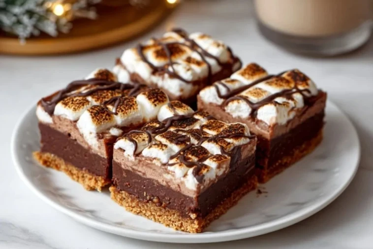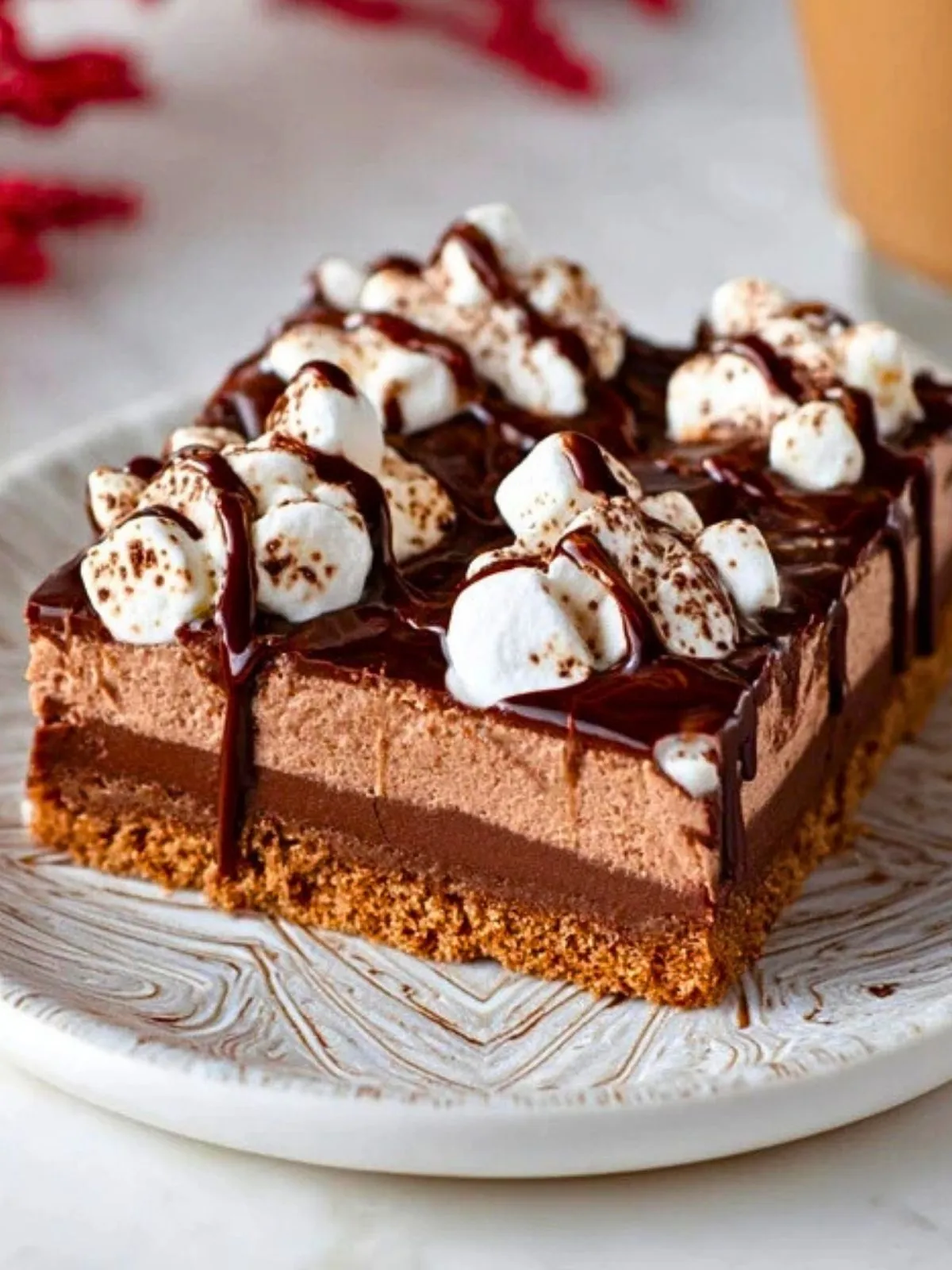 Ces barres de cheesecake au chocolat chaud allient une base croustillante, une crème onctueuse au fromage frais et chocolat, et une couche de guimauves dorées. Un dessert réconfortant, idéal pour les soirées d’hiver ou pour impressionner à un goûter gourmand !