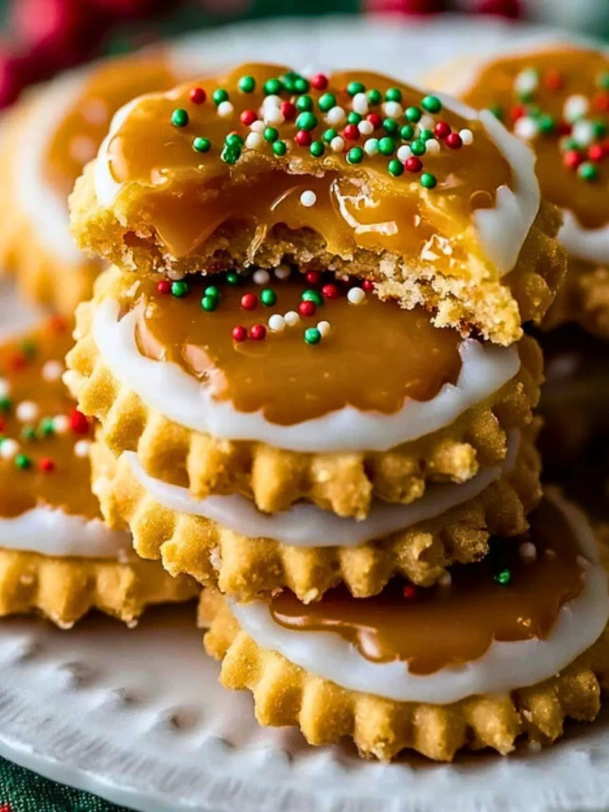 Le secret de ces biscuits réside dans l’alliance inattendue mais sublime entre le biscuit sablé classique et le craquelin Ritz, qui apporte une note salée et une texture légère. Le caramel maison coule délicatement à chaque bouchée, tandis que le glaçage sucré et les petites perles décoratives ajoutent une touche festive irrésistible.