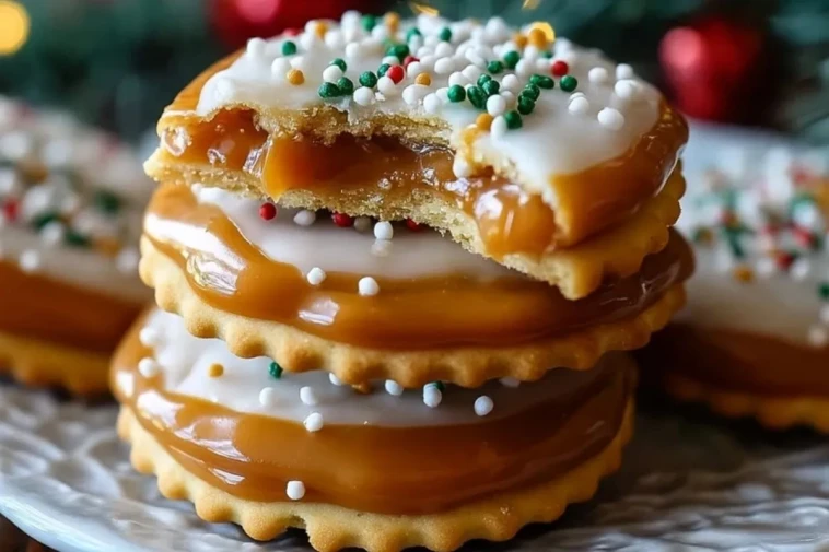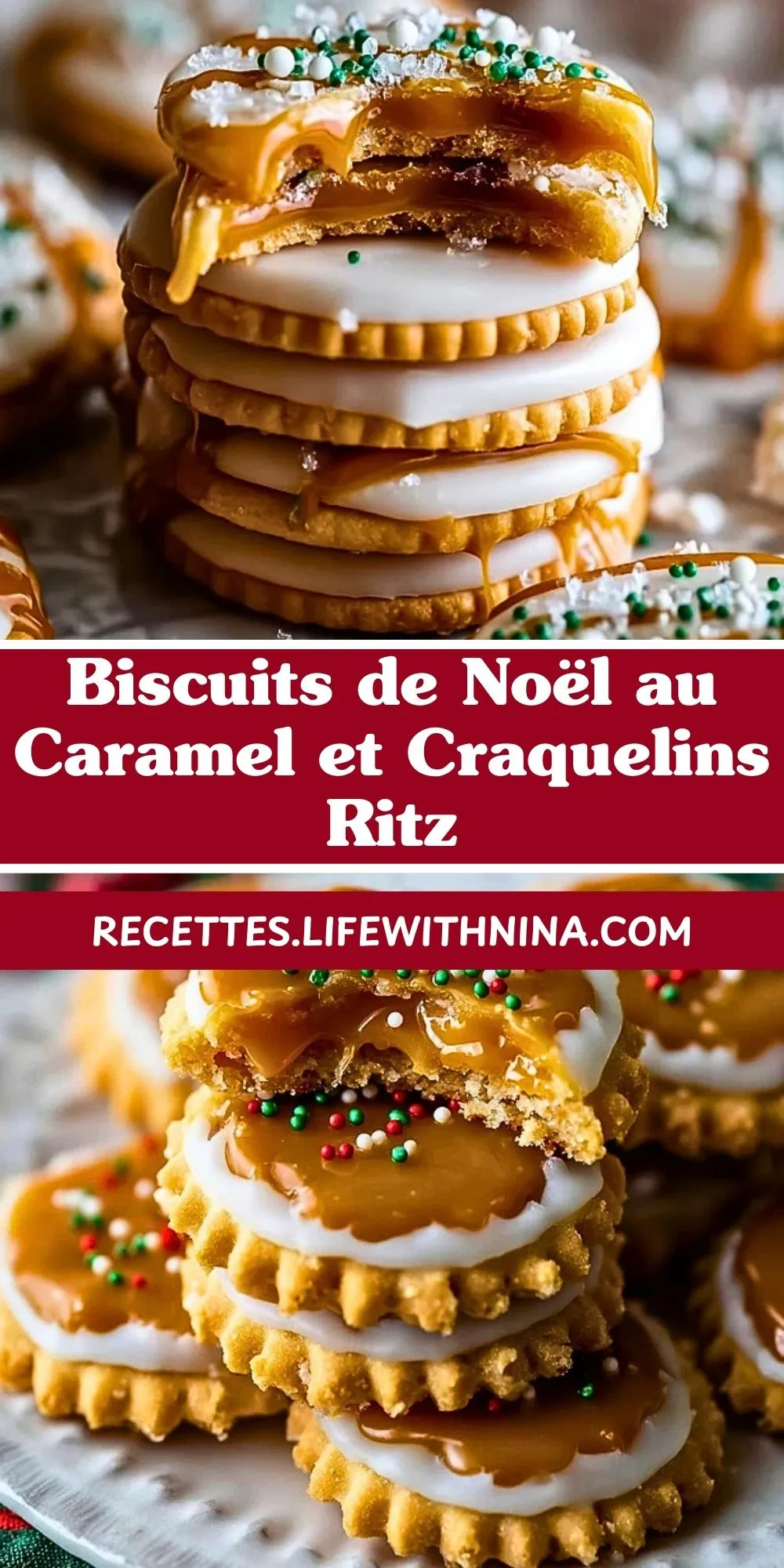 Des biscuits festifs au cœur fondant de caramel, enveloppés de deux craquelins Ritz croustillants, nappés d’un glaçage blanc et décorés de perles de sucre colorées. Une gourmandise parfaite pour Noël, à la fois élégante, rapide à préparer et absolument irrésistible.