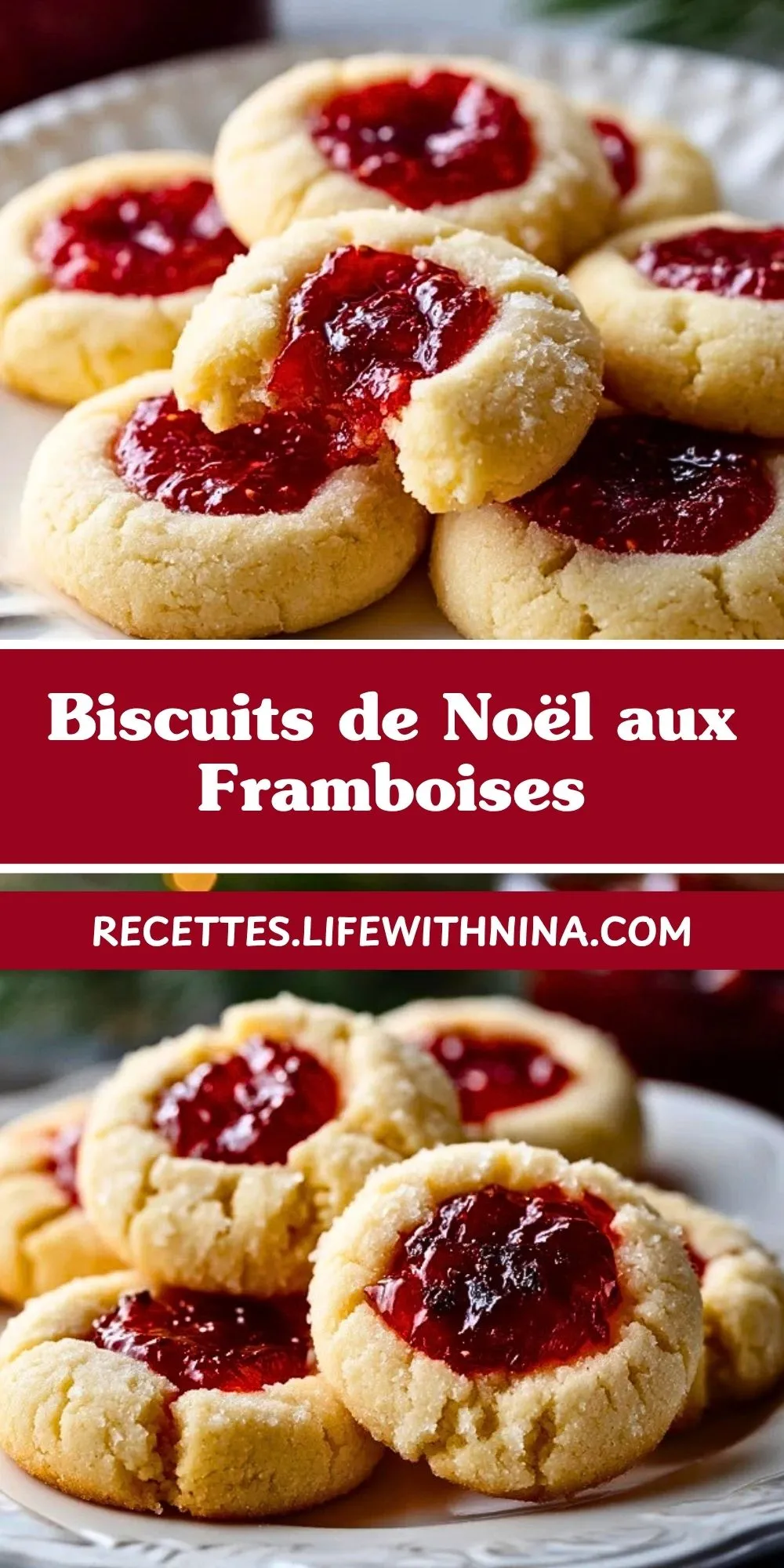 Ces biscuits de Noël aux framboises sont de tendres sablés au beurre garnis d’un cœur de confiture fruitée, parfaits pour les fêtes, les cadeaux gourmands ou les plateaux de biscuits à partager. Leur texture fondante, leur jolie finition et leur saveur douce relevée par l’acidité de la framboise en font une gourmandise aussi simple qu’élégante.