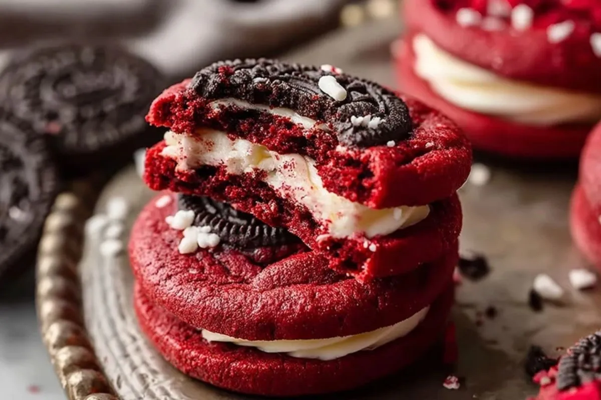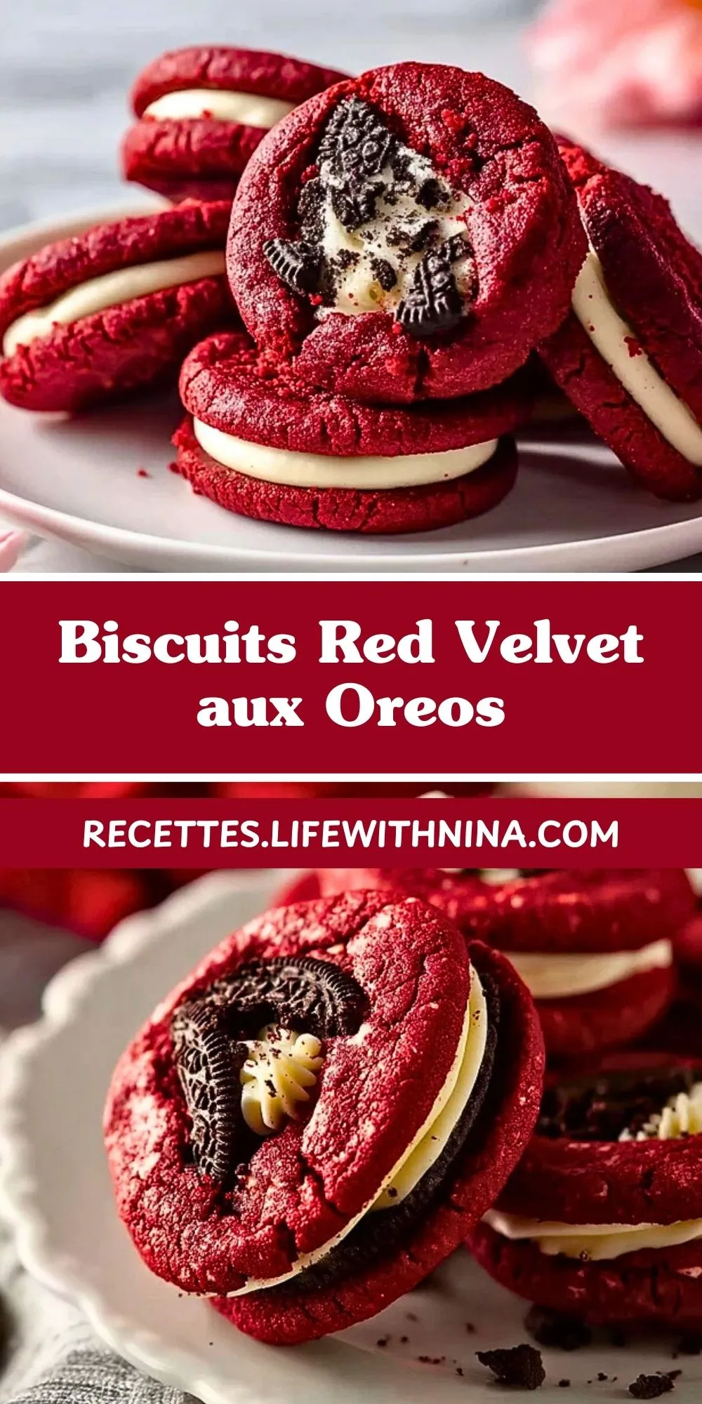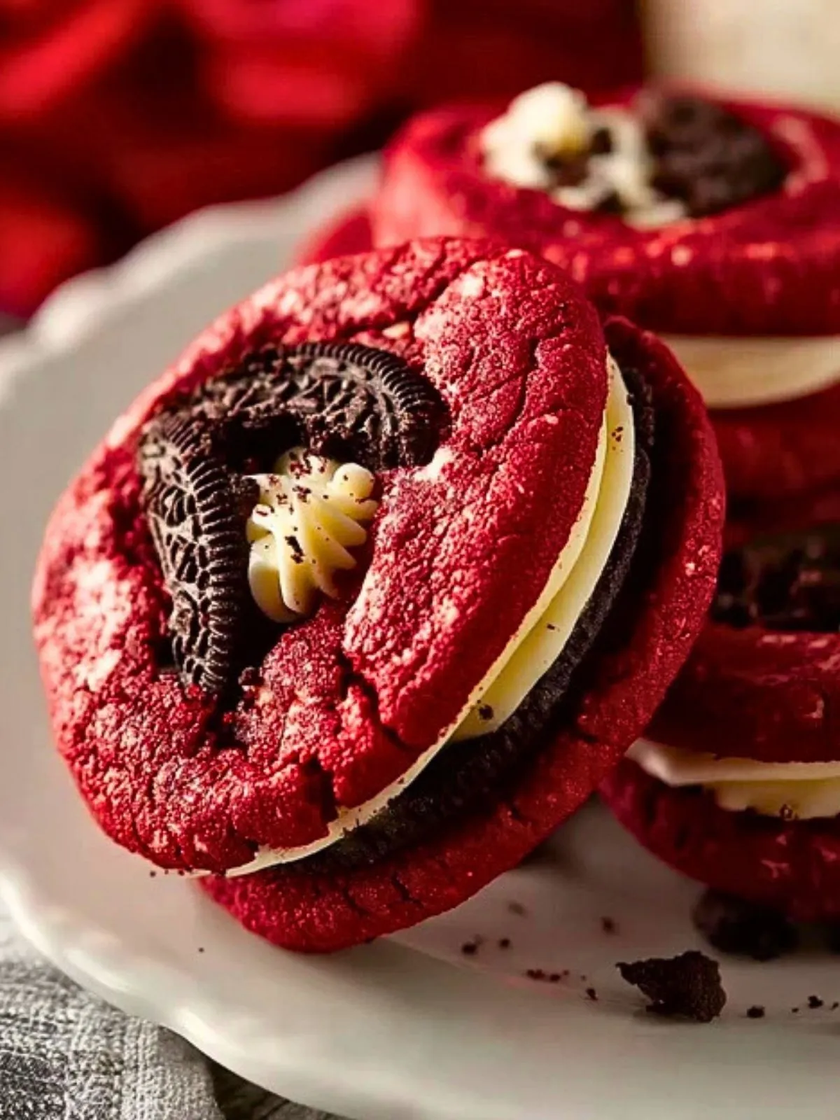 Ces biscuits Red Velvet aux Oreos sont tendres, riches et très gourmands, avec une légère note de cacao, des morceaux de biscuits chocolatés et une garniture crémeuse qui les rend encore plus irrésistibles. Ils sont parfaits pour un dessert festif, un goûter original ou une occasion spéciale.