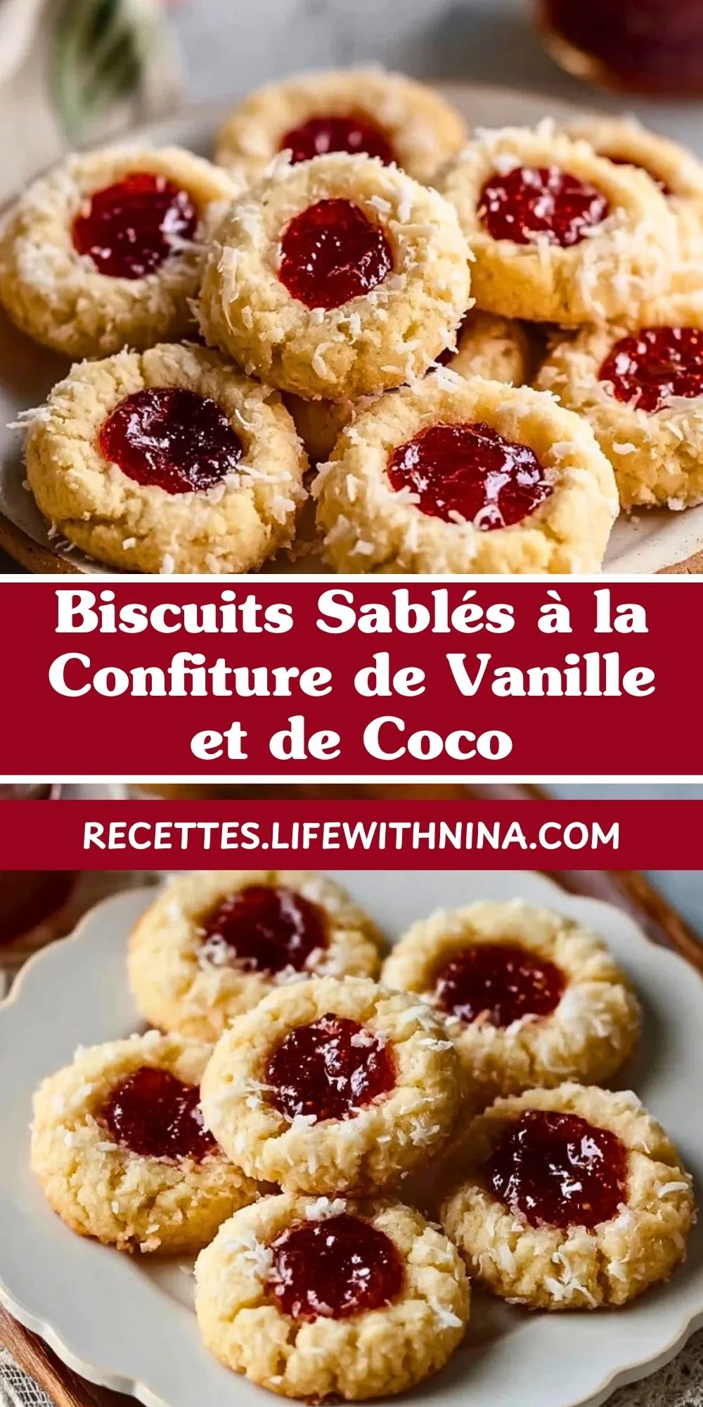 Ces biscuits sablés à la confiture de vanille et de coco sont une gourmandise délicate, au cœur fruité et à la texture fondante. Parfaits pour accompagner un café, un thé ou pour offrir, ils raviront petits et grands.