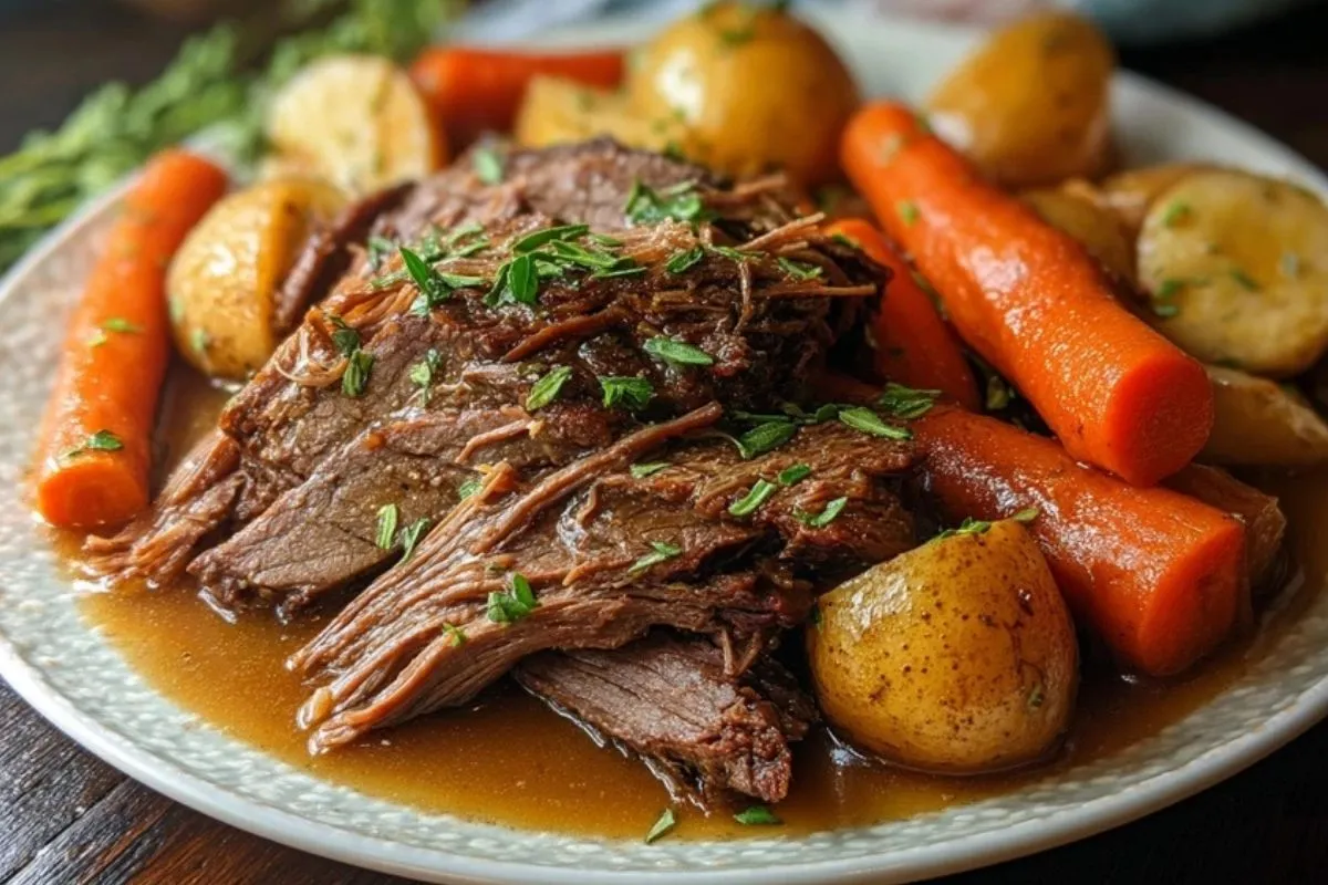 Un grand classique familial, ce boeuf mijoté révèle une viande ultra fondante, baignée dans une sauce parfumée, accompagnée de carottes et pommes de terre moelleuses. Parfait pour réchauffer les cœurs lors d’un repas convivial et généreux !