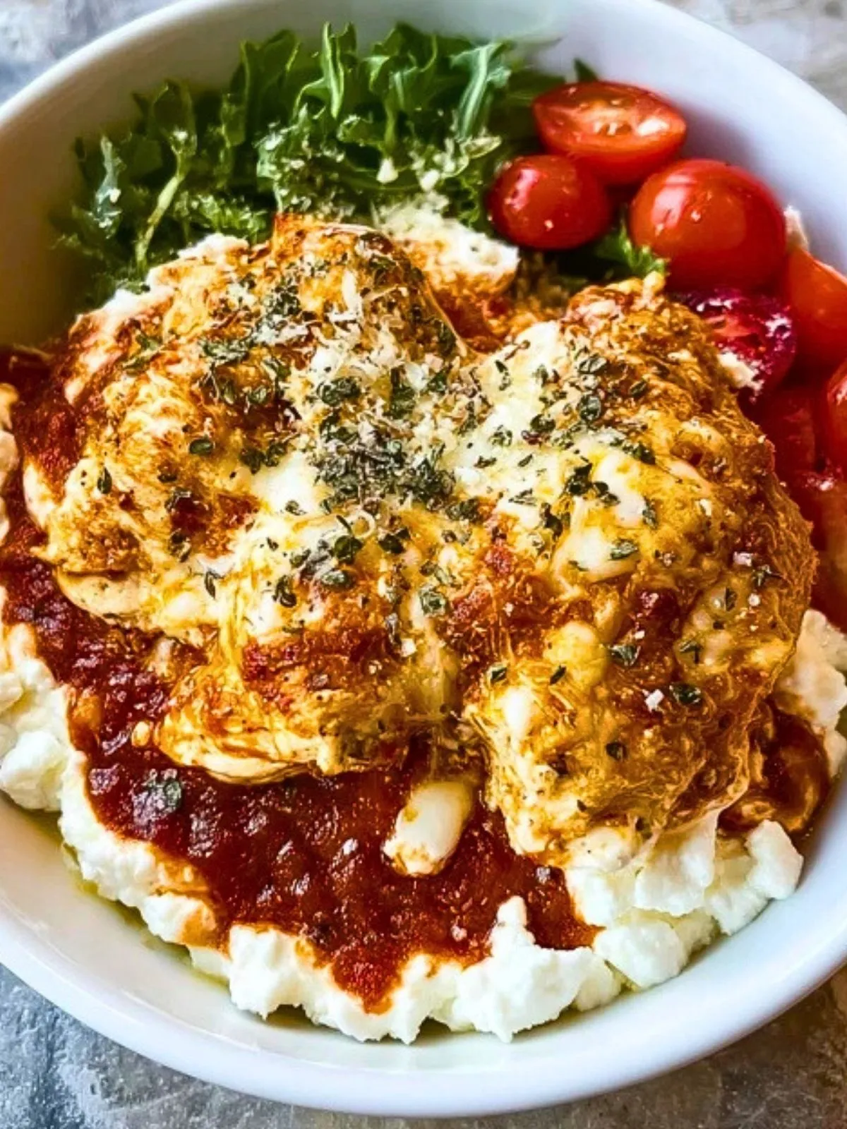 Ce bol de poulet parmesan riche en protéines avec fromage cottage est le genre de repas qui cale vraiment tout en restant léger. Le poulet est fondant, nappé d’une sauce tomate parfumée aux herbes, le tout déposé sur un lit de fromage cottage crémeux qui apporte une belle dose de protéines sans alourdir l’assiette.