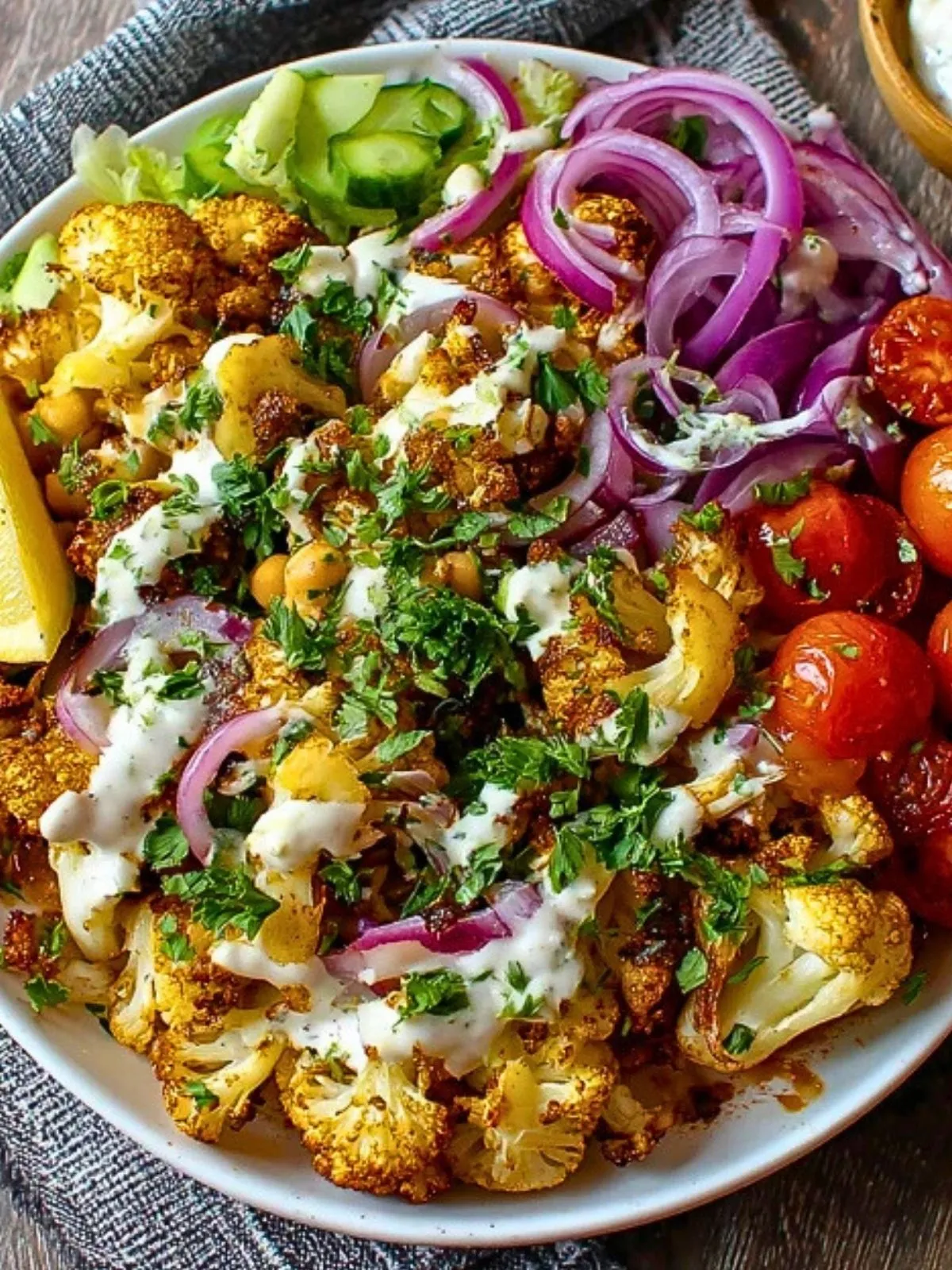 Autour de ce chou-fleur généreusement assaisonné, on retrouve des pois chiches grillés, un couscous moelleux, des légumes frais et croquants, ainsi qu’une sauce au yaourt citronnée bien fraîche. Un repas complet, réconfortant et léger à la fois, parfait pour un déjeuner de semaine ou un dîner convivial.