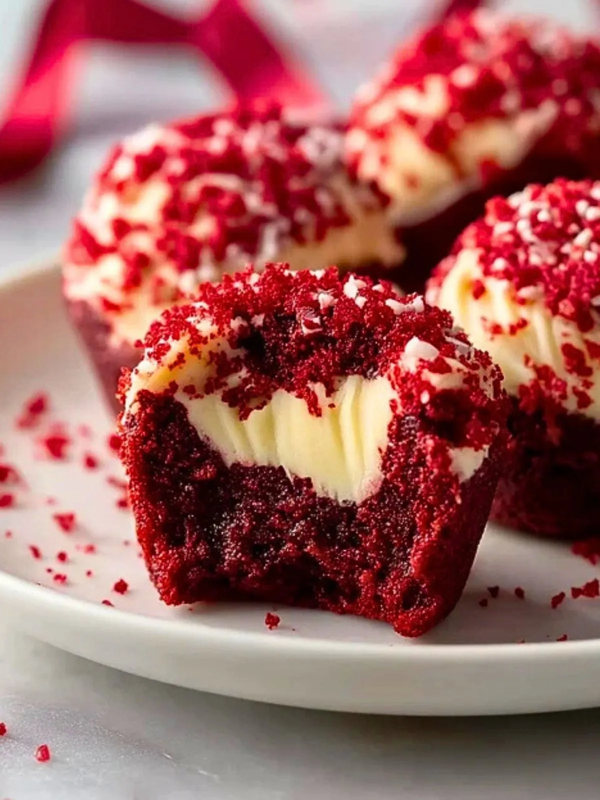 Une fois les bouchées refroidies, émiettez une ou deux d’entre elles pour obtenir de fines miettes rouges. Parsemez ces miettes sur le dessus des bouchées pour un effet velours et une jolie finition professionnelle. Servez à température ambiante ou légèrement fraîches.