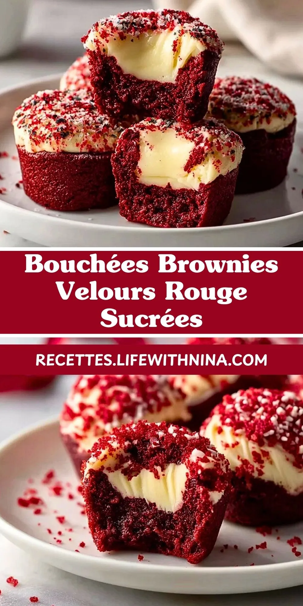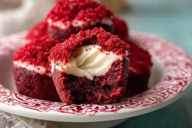 Ces bouchées brownies velours rouge sucrées cachent un cœur crémeux au fromage frais dans un brownie rouge profond, fondant et légèrement cacaoté, pour de petites douceurs spectaculaires et terriblement gourmandes.