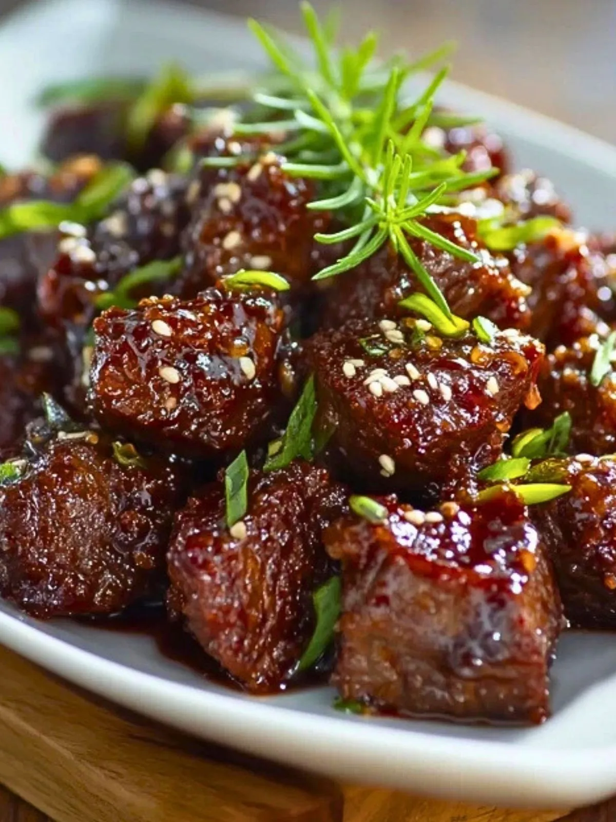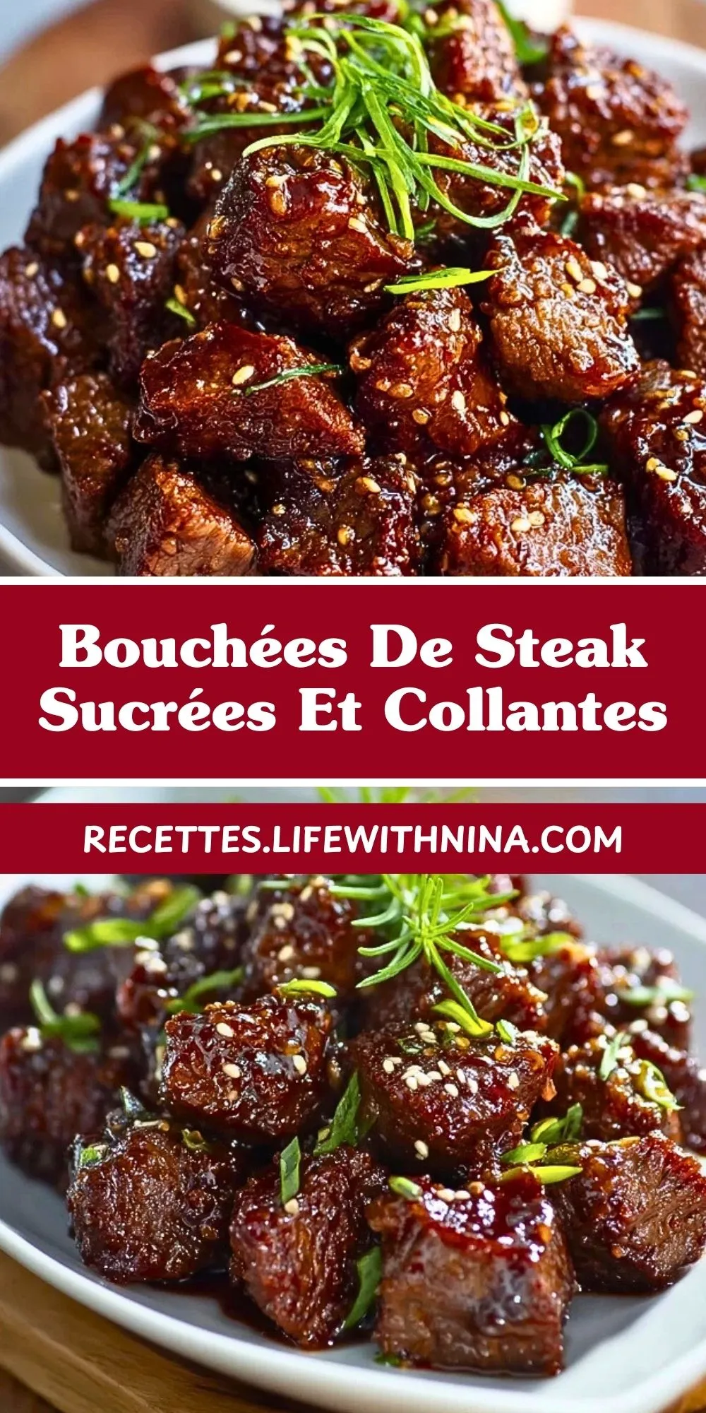 Imaginez des morceaux de steak fondants en bouche, enrobés d’une sauce riche, sucrée et collante, ponctuée de notes de soja, de miel et d’épices. Ces bouchées de steak sucrées et collantes apportent une explosion de saveurs à chaque bouchée, parfaites à l’apéritif, en plat principal avec un bol de riz parfumé ou même à grignoter lors d’une soirée conviviale.