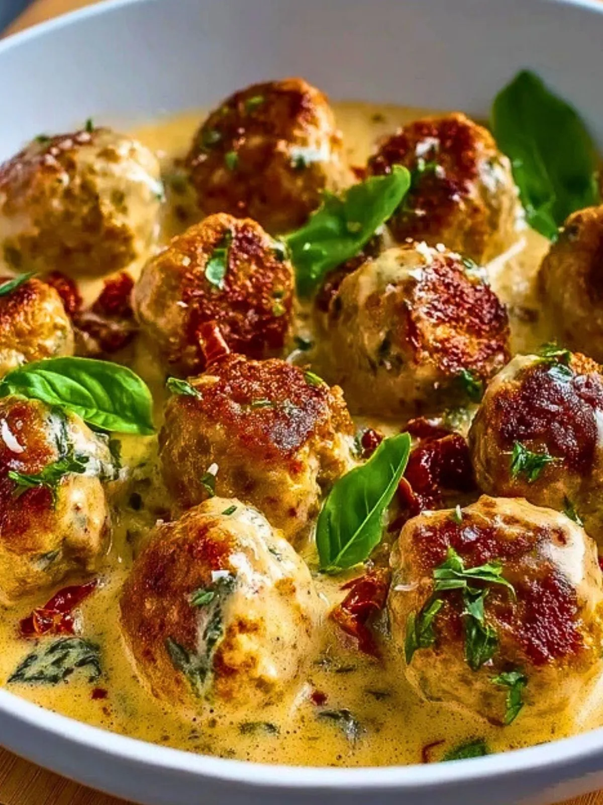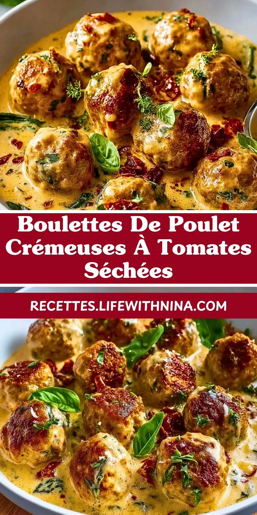 Keywords: boulettes de poulet, tomates séchées, sauce crémeuse, parmesan, plat réconfortant