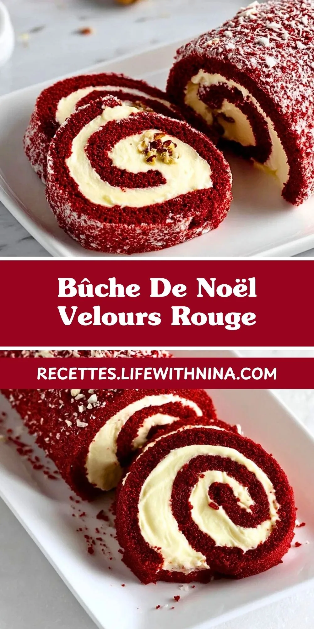 Bûche de Noël spectaculaire au biscuit génoise rouge velours ultra moelleux, garnie d’une crème mascarpone-fromage frais légère et onctueuse. Un dessert de fête, élégant, coloré et inoubliable, parfait pour épater vos invités lors du réveillon.