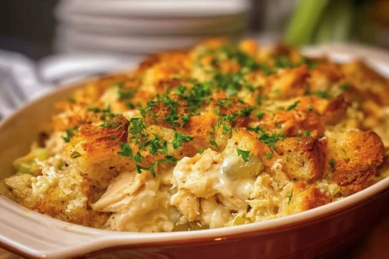 Cette casserole de poulet et de farce délicieuse est le genre de plat réconfortant que l’on aime préparer quand on veut quelque chose de simple, généreux et vraiment satisfaisant. Entre le poulet fondant, la sauce crémeuse, les légumes tendres et la couche de farce bien dorée sur le dessus, chaque bouchée rappelle les grands classiques familiaux servis bien chauds au centre de la table.