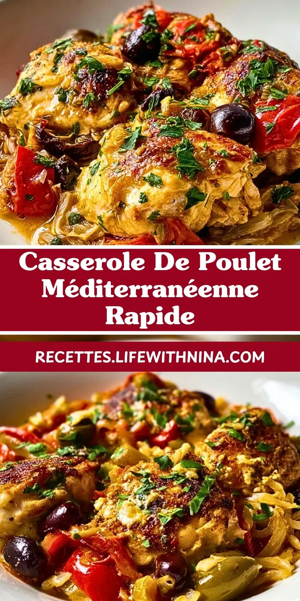 Casserole De Poulet Mediterraneenne Rapide aux saveurs ensoleillees avec poulet dore, poivrons fondants, olives et sauce tomate parfumee aux herbes. Plat complet, rapide et familial.