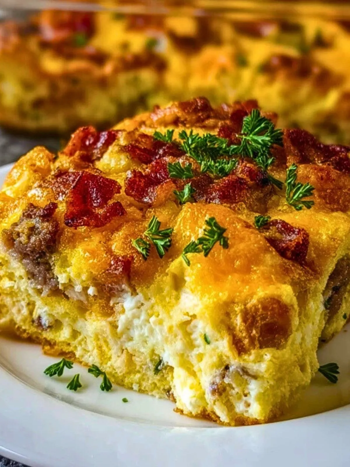 Facile à préparer à l’avance, cette casserole permet de profiter du petit-déjeuner sans stress. Il suffit de quelques minutes de préparation la veille pour se réveiller avec un plat chaud, parfumé et généreux. Les couches savoureuses de pain, viande et fromage sont imprégnées d’un appareil à œuf crémeux, offrant une texture à la fois fondante et croustillante. C’est le plat idéal pour commencer la journée avec le sourire !