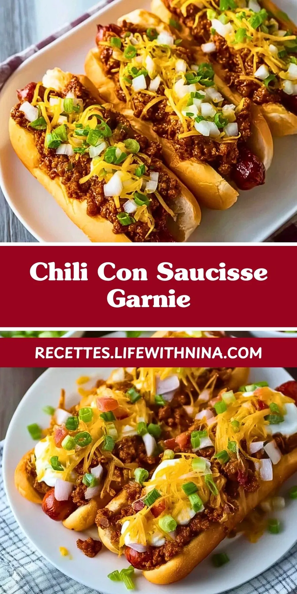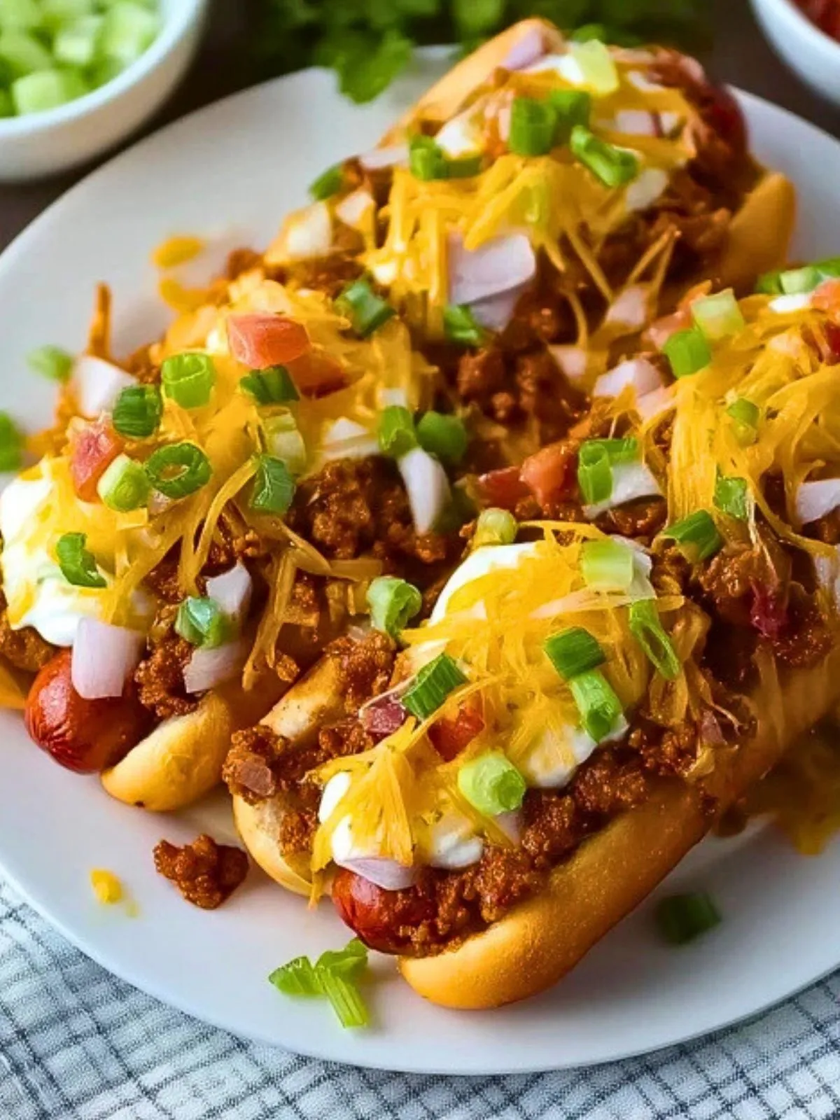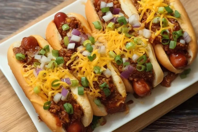 Ce chili con saucisse garnie est un hot-dog ultra gourmand : des saucisses bien grillées dans un pain moelleux, couvertes d’un chili maison au bœuf épicé, de cheddar fondu et d’oignons croquants, parfait pour les soirées conviviales, les matchs ou une street food maison généreuse.