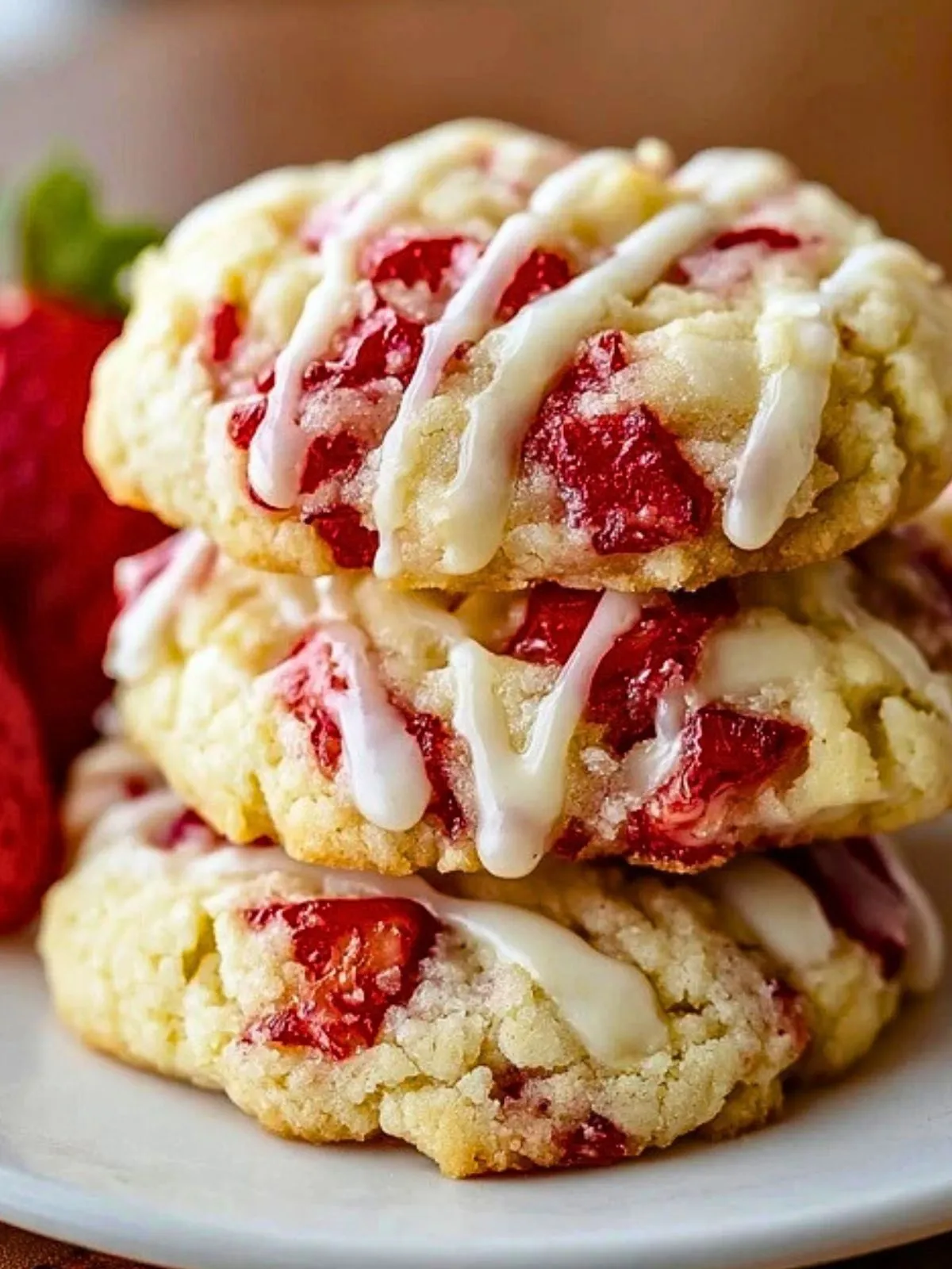 Servez ces cookies au goûter, avec un café, un thé ou un verre de lait froid. Ils sont particulièrement délicieux le jour même, quand leur texture reste très moelleuse et que les fraises gardent toute leur fraîcheur. Pour un dessert plus raffiné, vous pouvez aussi les accompagner d’une boule de glace à la vanille ou d’un peu de crème fouettée.