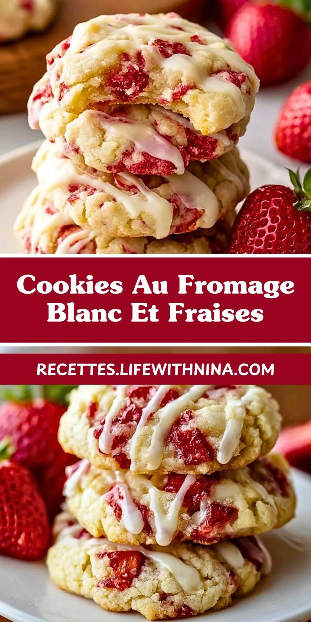 Parce qu’ils sont à la fois moelleux, parfumés et faciles à réussir. Le fromage blanc apporte de la douceur sans alourdir la pâte, et les fraises donnent une note fruitée qui change des cookies classiques aux pépites de chocolat. C’est une recette parfaite pour varier les plaisirs avec une biscuiterie maison à la fois simple et raffinée.