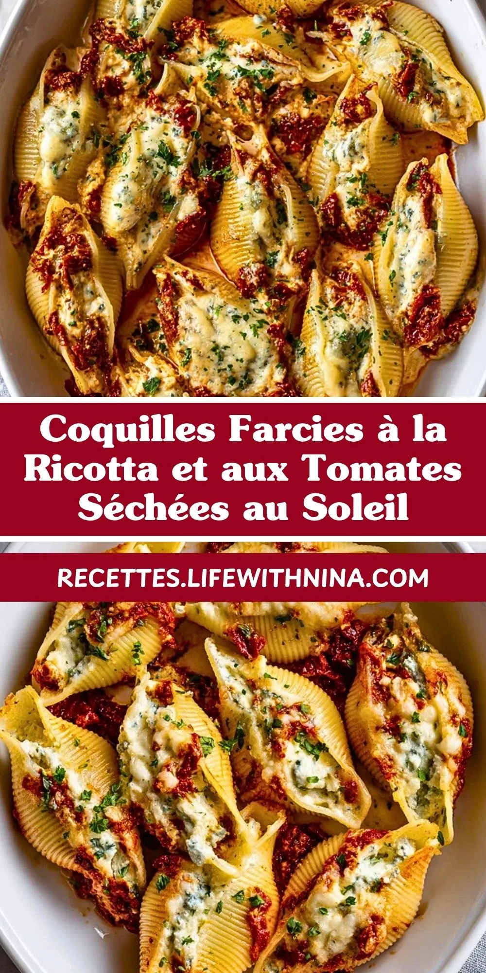 Keywords: coquilles farcies, ricotta, tomates séchées, conchiglioni, pâtes gratinées