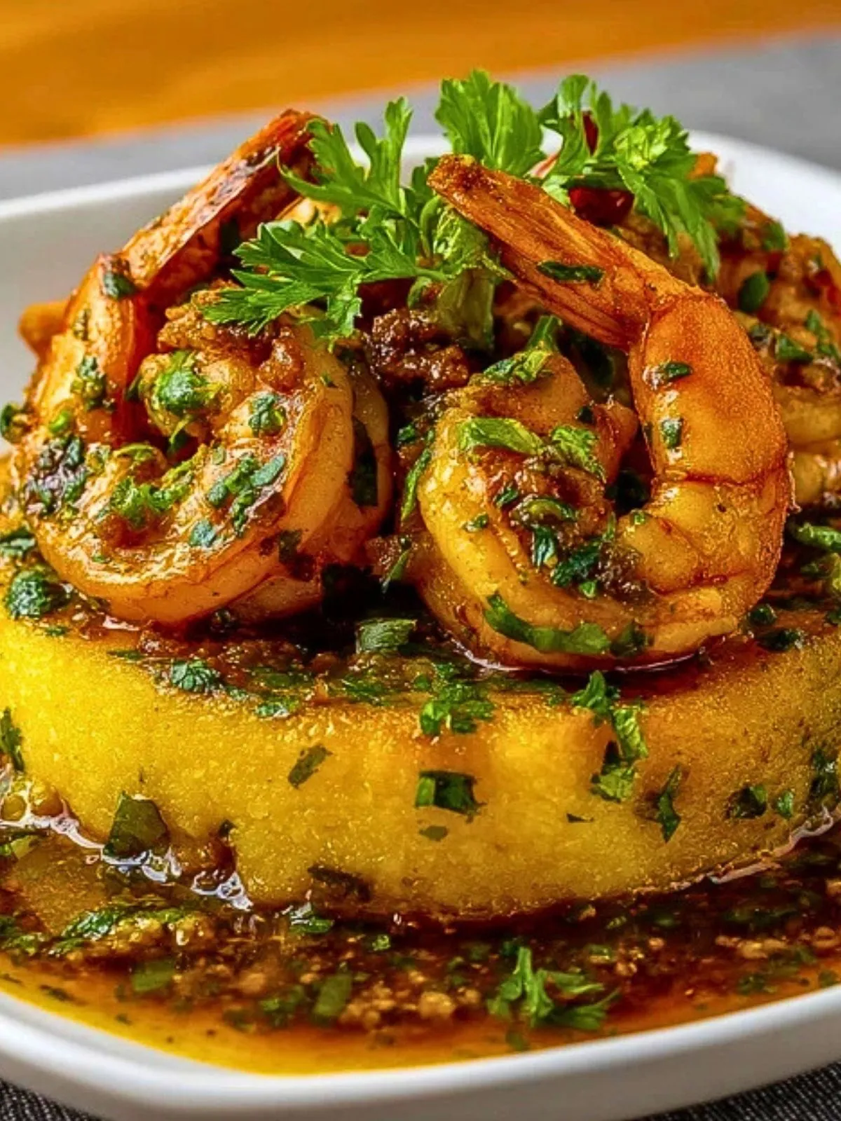 Disposez un disque de mofongo au centre de chaque assiette. Nappez généreusement de crevettes à l’ail et de leur sauce. Décorez avec un brin de persil frais et servez sans attendre.
