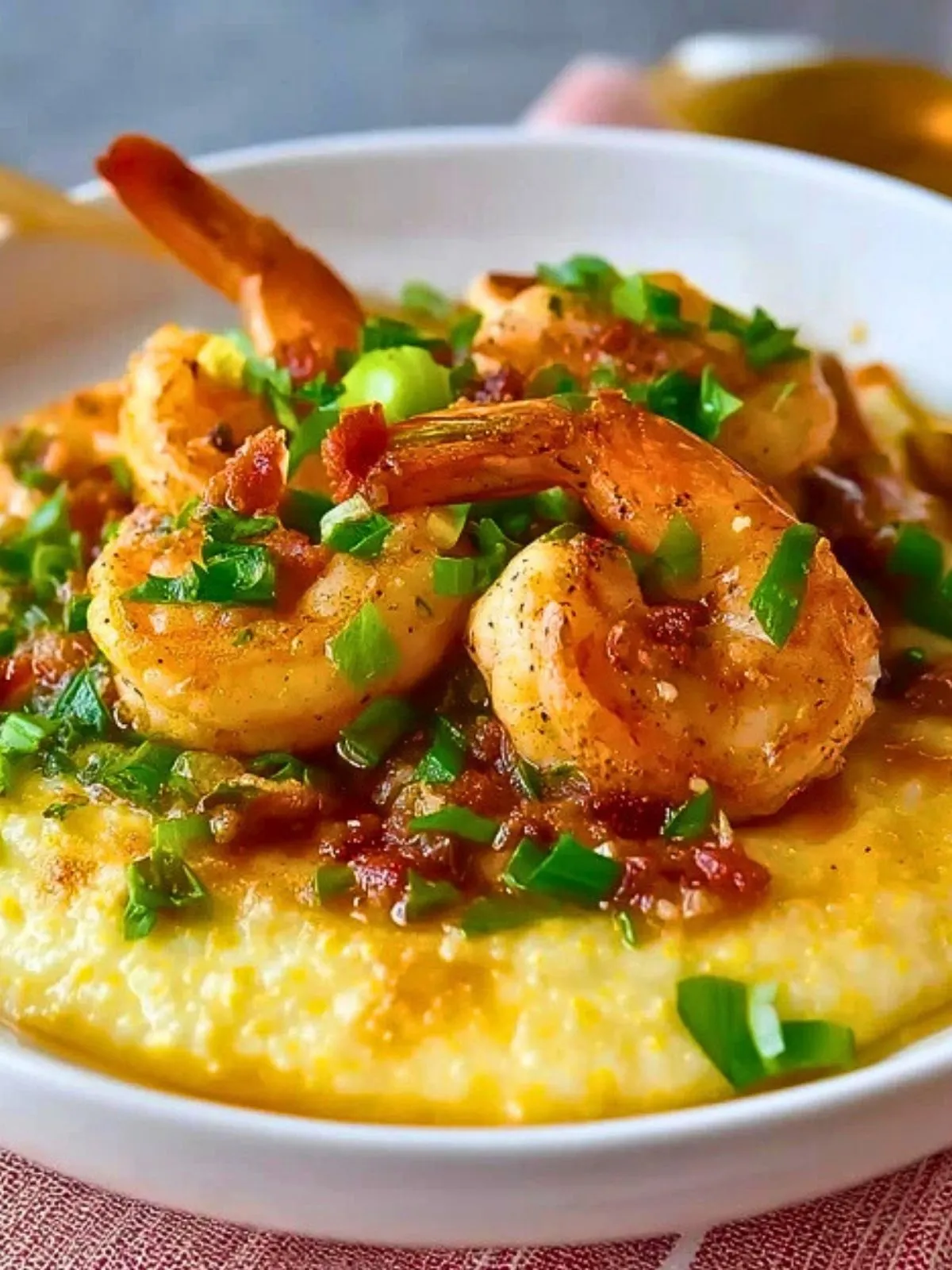 4. Répartir les grits chauds dans des bols, disposer les crevettes par-dessus, ajouter le bacon et parsemer d’oignons nouveaux. Servir immédiatement.