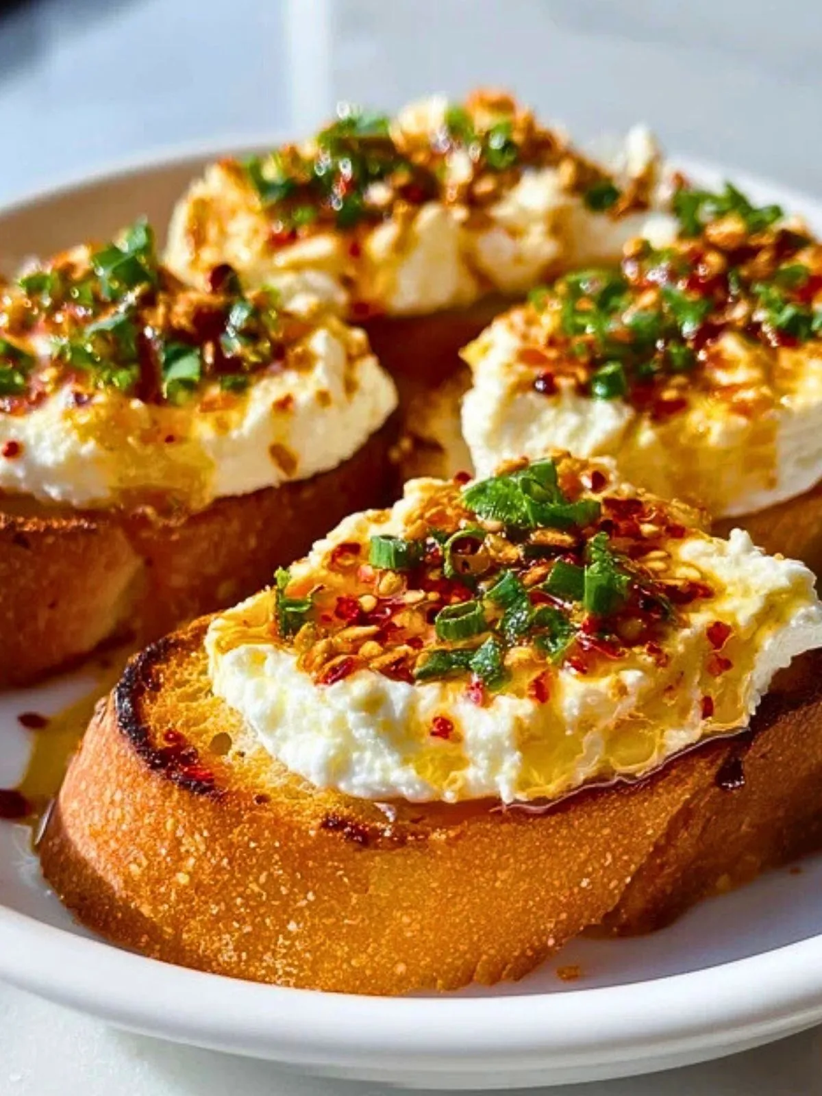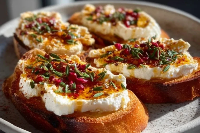 Ces crostinis à la feta fouettée et miel piquant marient le croquant du pain grillé, la douceur épicée du miel et le fondant d’une feta ultra onctueuse pour un apéritif chic, rapide et terriblement gourmand.