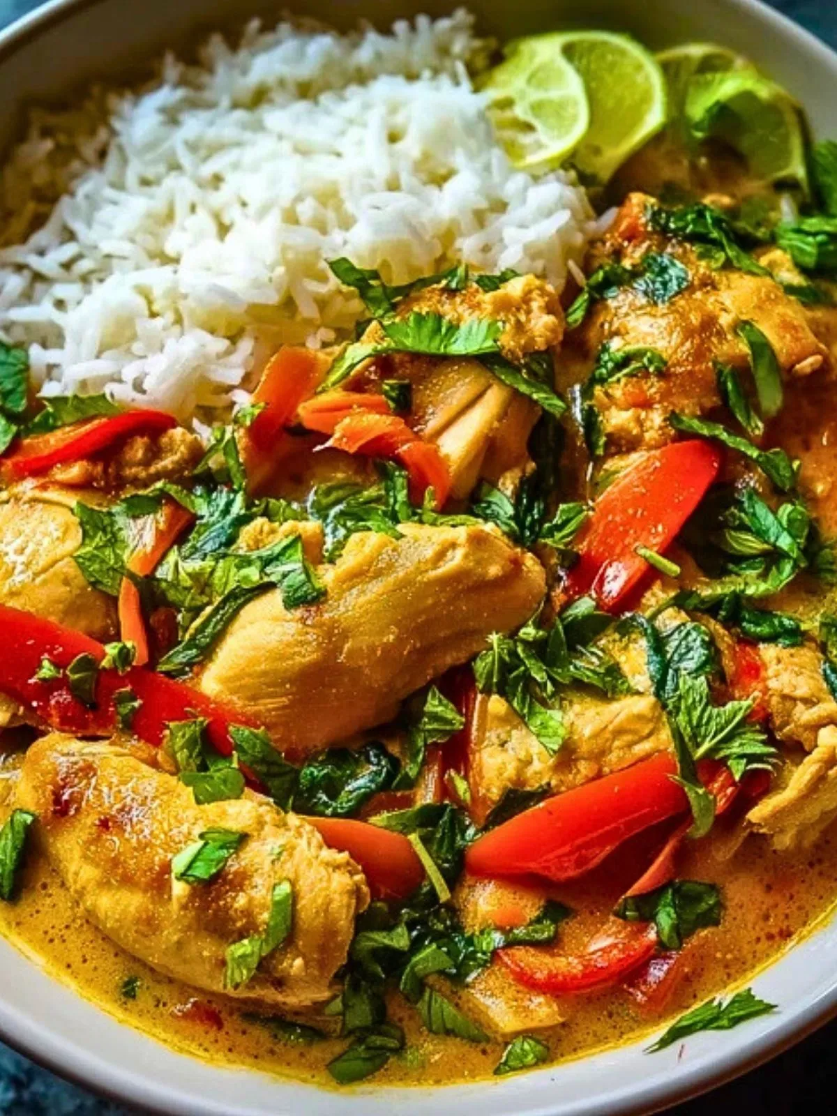 Un curry thaï crémeux et parfumé, où le poulet tendre mijote dans une sauce au lait de coco et aux épices, agrémenté de légumes fondants et d’herbes fraîches. Un voyage express en Thaïlande, facile à réaliser à la maison et parfait pour un dîner dépaysant.