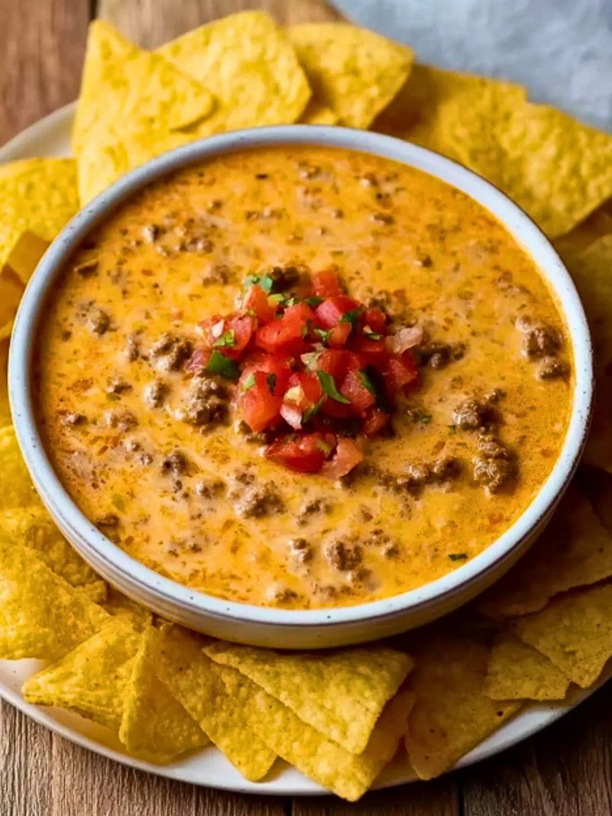 Un dip chaud, crémeux et très gourmand, préparé avec de la viande hachée bien assaisonnée, des tomates, du fromage fondant et une touche de crème. Parfait pour un apéritif convivial, une soirée entre amis ou un repas décontracté à partager avec des chips, du pain grillé ou des légumes croquants.