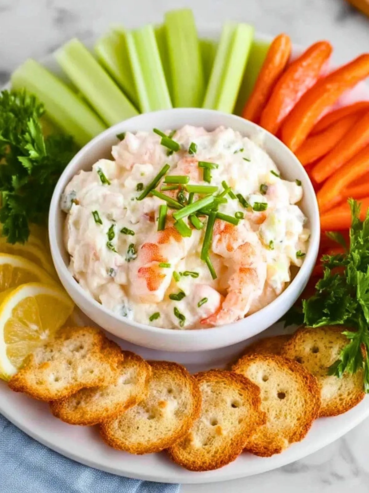 Décorez de ciboulette et de quelques crevettes entières avant de servir avec des tranches de pain grillé, des bâtonnets de légumes ou des crackers.