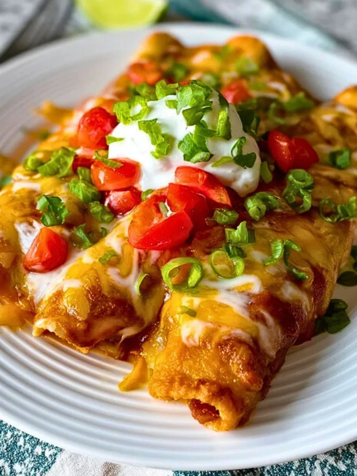 14. À la sortie du four, laisser reposer les enchiladas 5 minutes, puis servir avec une cuillerée de crème fraîche, des oignons nouveaux, des dés de tomate, de la coriandre et un quartier de citron vert.