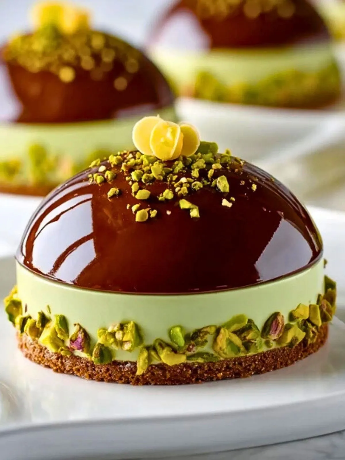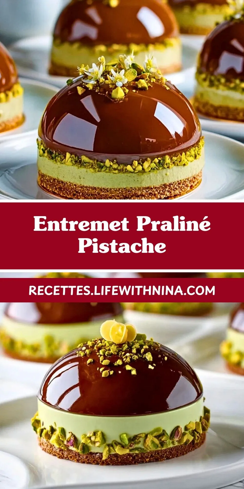 Sous son glaçage miroir brillant, ce dessert cache un biscuit moelleux, une mousse aérienne au praliné et un crémeux à la pistache qui fond dans la bouche. Sa présentation élégante, rehaussée de pistaches concassées, en fait une véritable œuvre d’art pâtissière qui ravira les amateurs de douceurs raffinées.