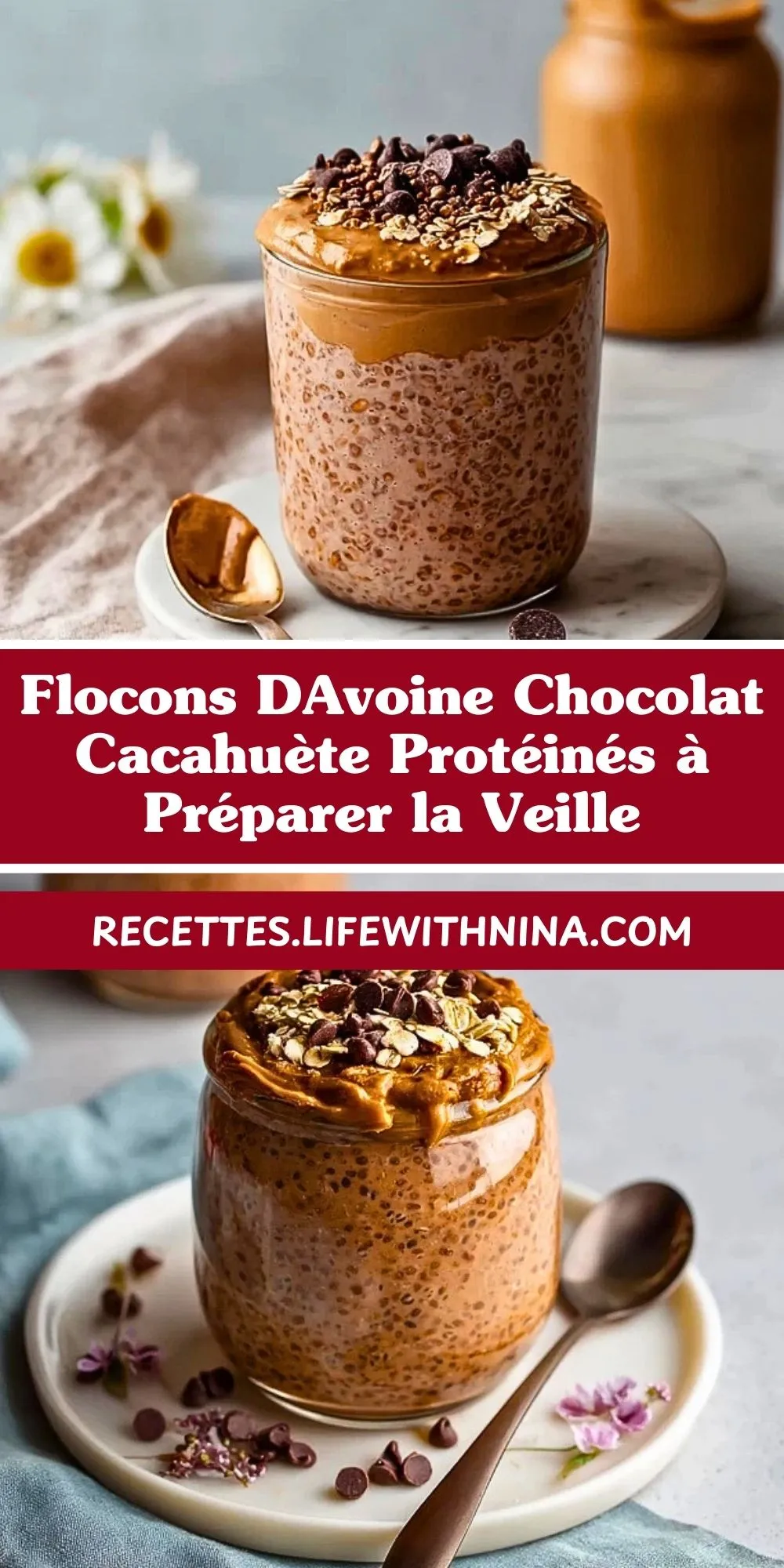 Parce qu’ils combinent praticité et équilibre. Vous préparez le mélange en 10 minutes le soir, vous laissez reposer au frais pendant la nuit, et au réveil tout est déjà prêt. Les flocons d’avoine s’imprègnent du lait, du yaourt et du cacao, la texture devient onctueuse, et la poudre de protéine associée au beurre de cacahuète apporte un vrai coup de pouce protéiné pour bien démarrer la journée.