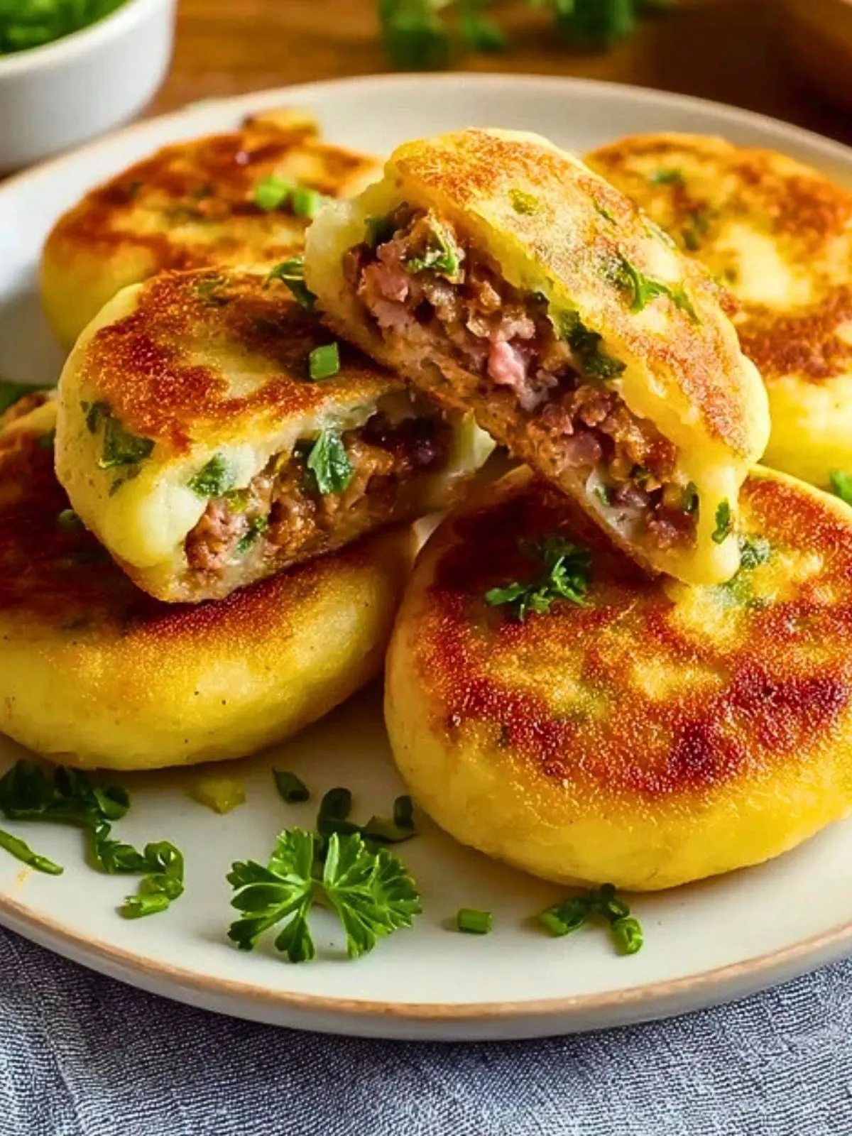 Des galettes de pommes de terre croustillantes à l’extérieur, moelleuses à l’intérieur et garnies d’une farce à la viande bien assaisonnée. C’est un plat familial, généreux et réconfortant, parfait pour un déjeuner complet ou un dîner simple accompagné d’une salade ou d’une sauce au yaourt.