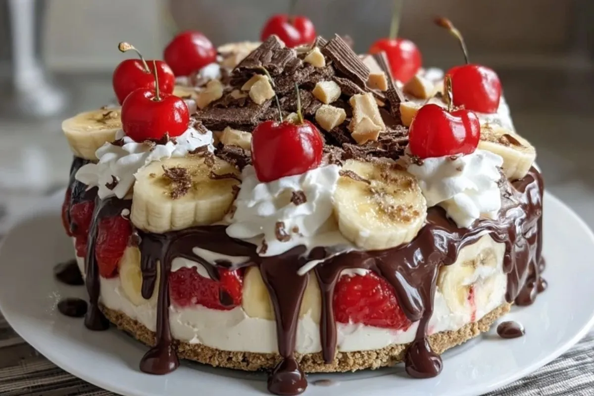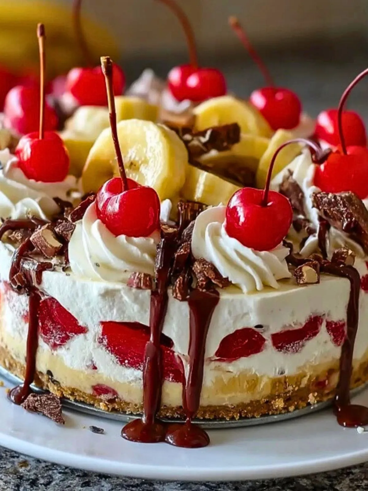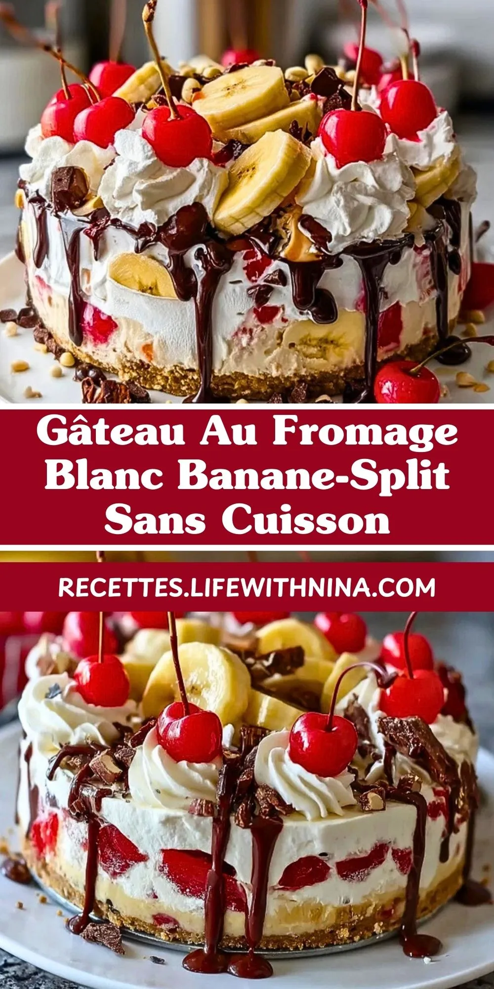 Un gâteau au fromage blanc façon banane-split, sans cuisson, frais, fondant, avec une base biscuitée croquante, une garniture mousseuse au fromage blanc et crème, des fruits frais (banane, fraise), un nappage au chocolat et une décoration festive à la cerise. Idéal pour finir un repas d’été ou fêter un événement tout en légèreté !