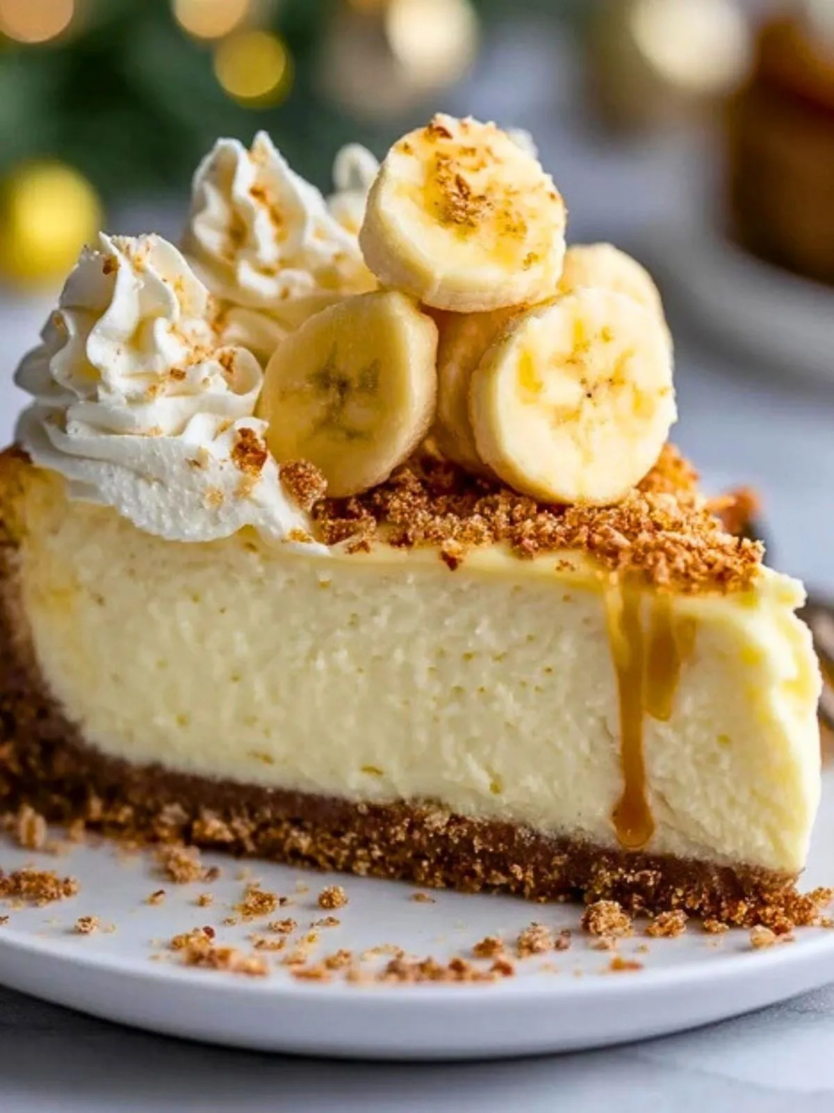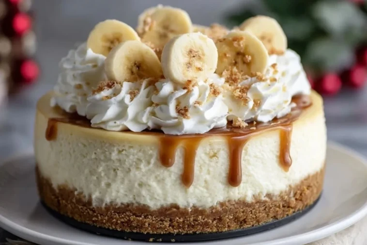 Ce gâteau au fromage crémeux à la banane marie une base biscuitée croustillante, un appareil au fromage ultra fondant et le parfum doux de la banane mûre, le tout nappé d’un caramel gourmand et d’une chantilly légère pour un dessert spectaculaire et réconfortant.