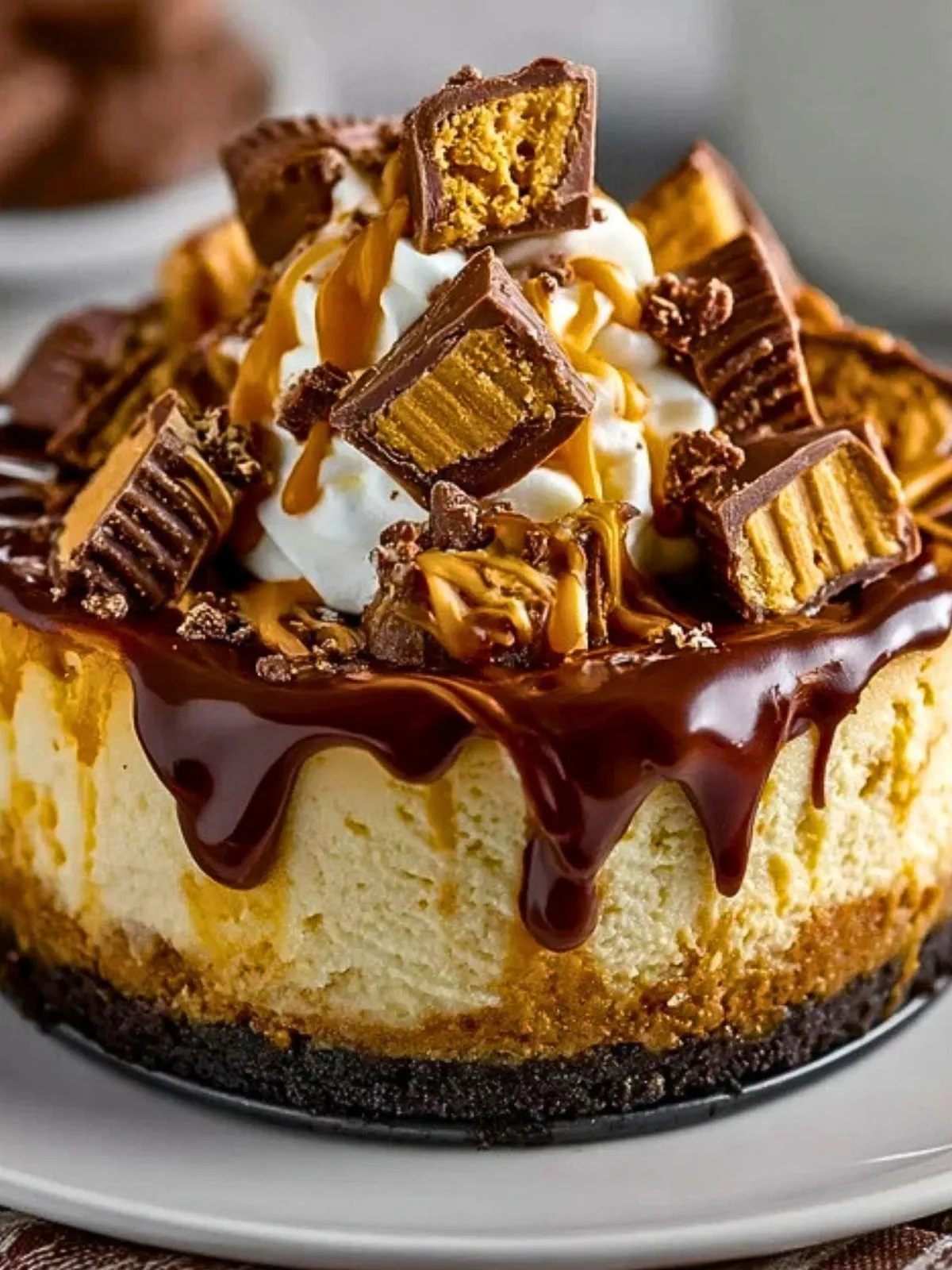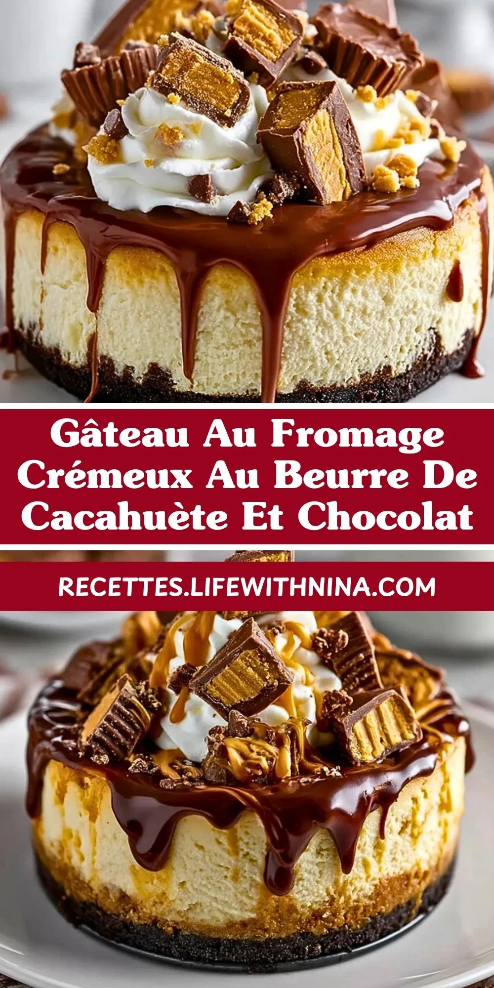 Un cheesecake ultra crémeux avec une base croustillante au chocolat, une garniture généreuse au fromage frais et beurre de cacahuète, nappé d’une ganache chocolat et décoré de morceaux fondants. Un dessert spectaculaire, idéal pour toutes les occasions festives ou pour se faire plaisir à la maison.