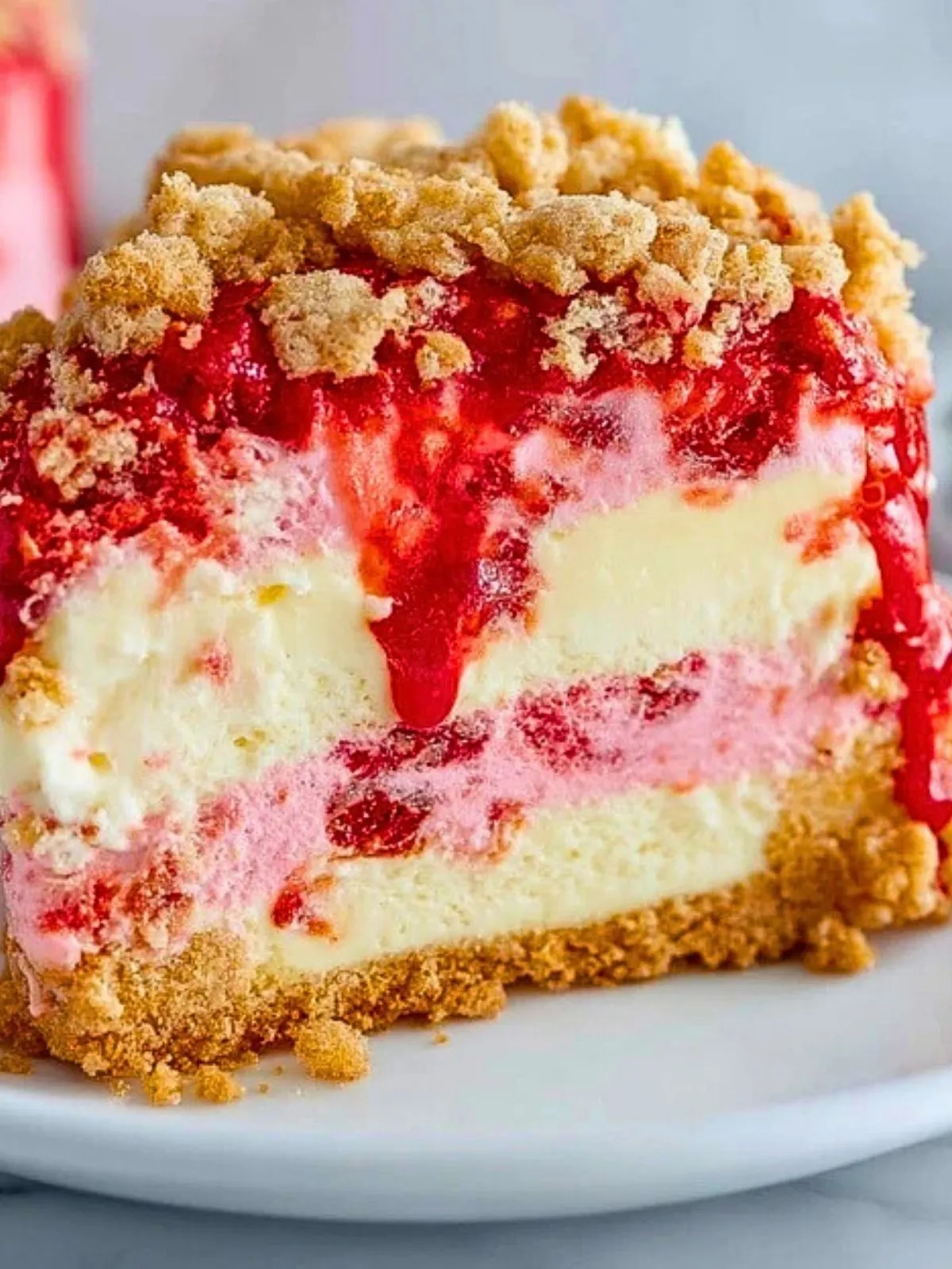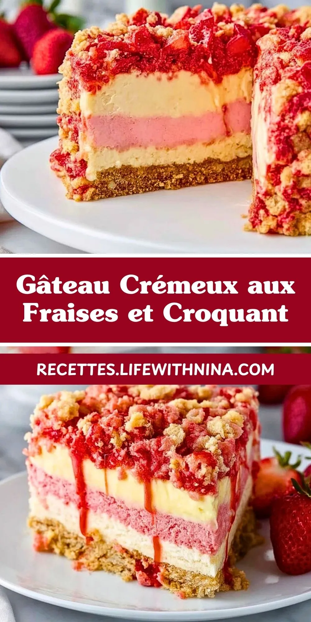 Un gâteau élégant, composé d’une base biscuitée croustillante, d’une mousse légère à la fraise, d’une couche crémeuse au fromage frais, et d’un crumble doré. Idéal pour les grandes occasions ou un dessert d’été inoubliable !