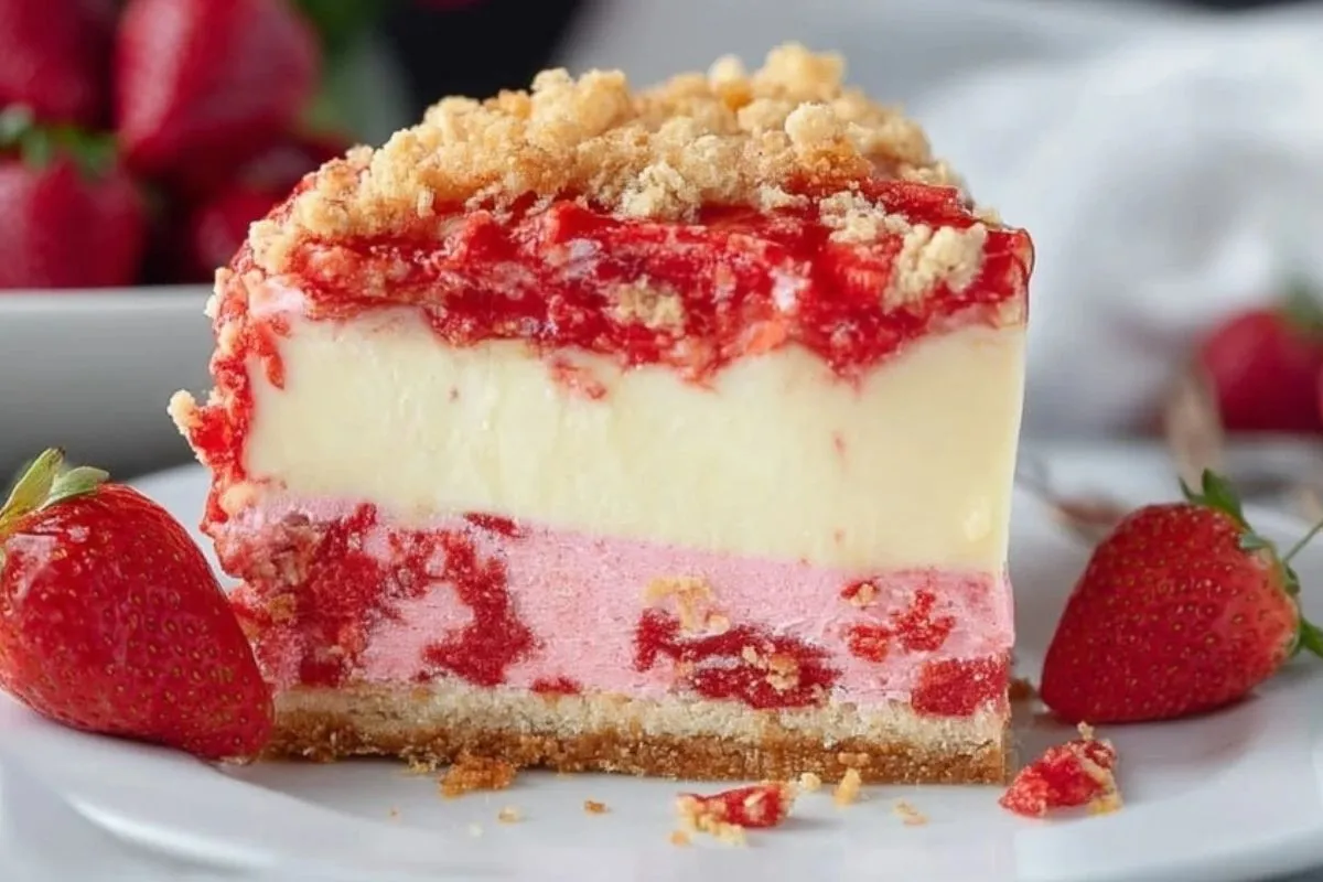 Imaginez une bouchée à la fois fondante, fraîche et croustillante : c’est la promesse de ce gâteau crémeux aux fraises et croquant. Sa base sablée se marie à la perfection avec une mousse légère à la fraise, une couche crémeuse façon cheesecake, et une pluie de crumble croquant qui rappelle les desserts d’enfance. Ce dessert séduira tous les amateurs de fruits et de textures contrastées.