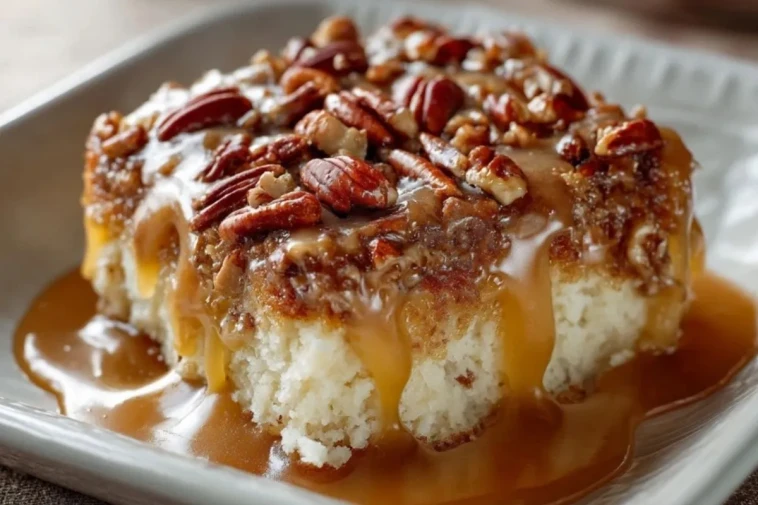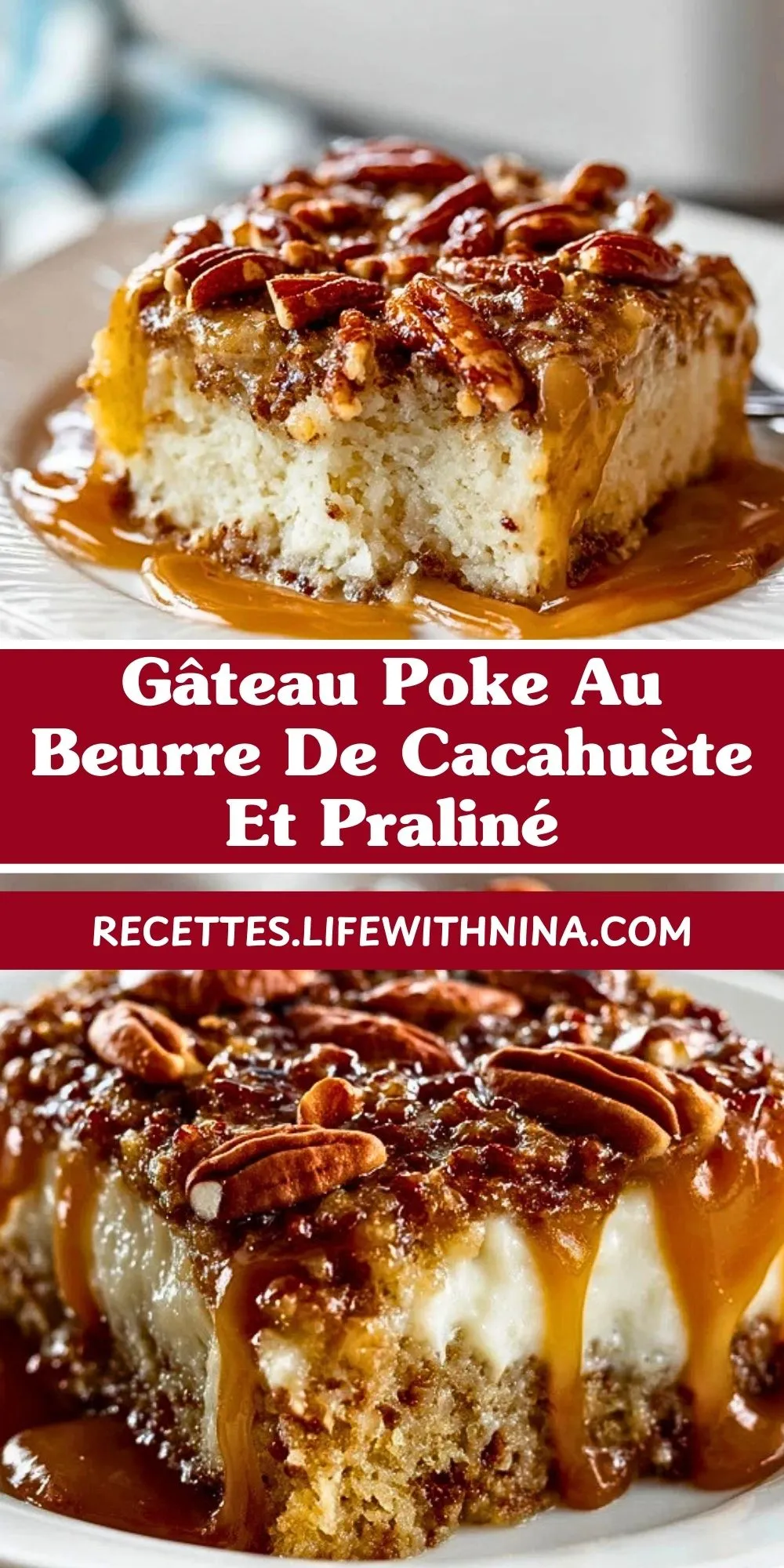 Le Gâteau Poke Au Beurre De Cacahuète Et Praliné est un dessert ultra gourmand qui marie la douceur d’un gâteau moelleux à la richesse d’un nappage coulant. Les trous réalisés après cuisson permettent à la sauce pralinée et au beurre de cacahuète de s’infiltrer profondément, rendant chaque bouchée intensément fondante.