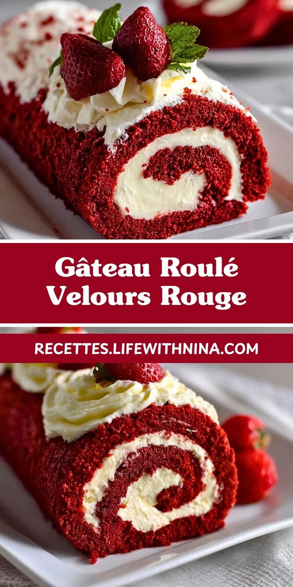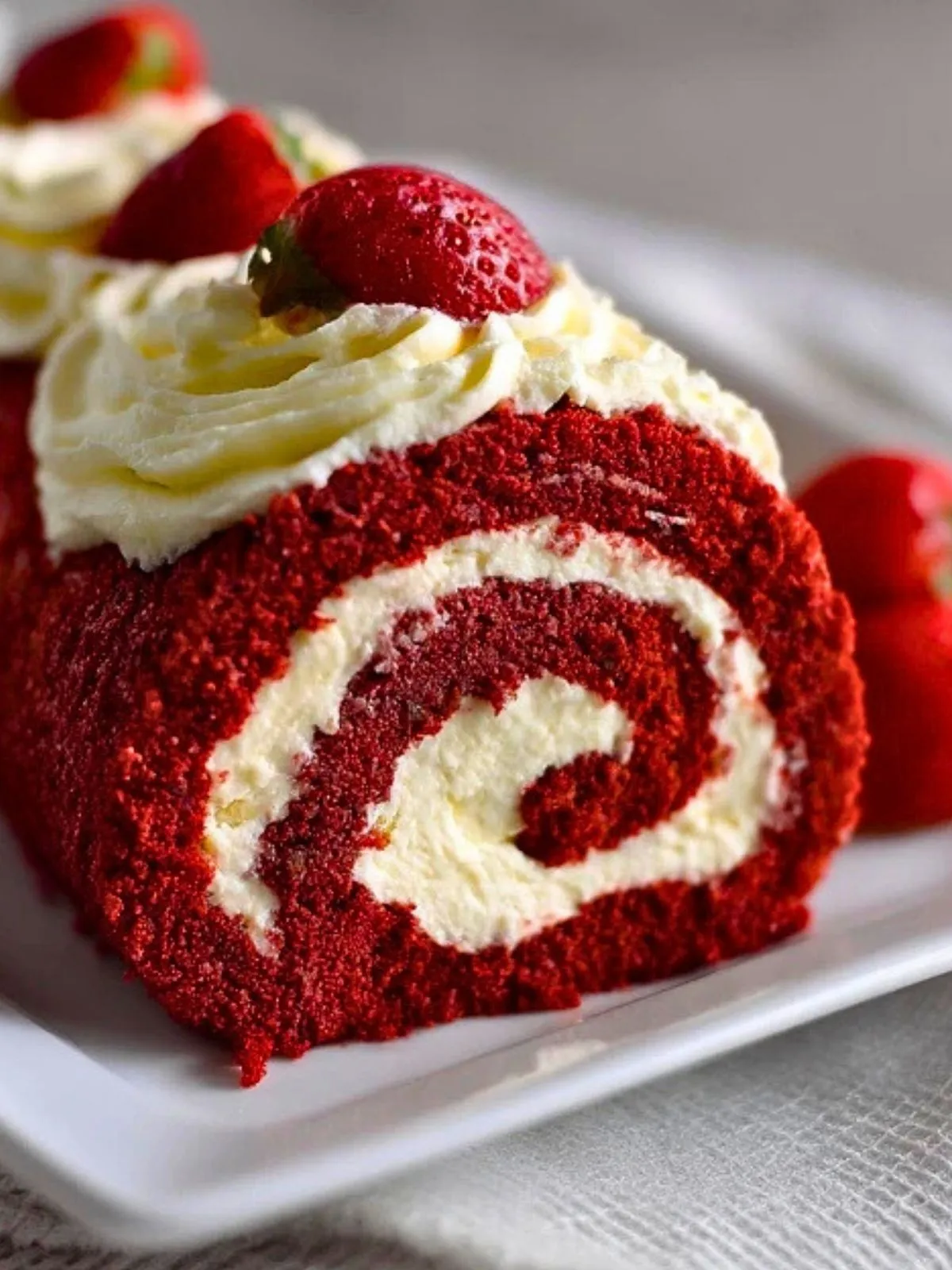 Un gâteau roulé léger et moelleux, à la couleur rouge profonde et au parfum subtil de cacao, garni d’une crème mascarpone aérienne et décoré de fraises fraîches. Idéal pour les occasions festives, il allie élégance et gourmandise à la française.