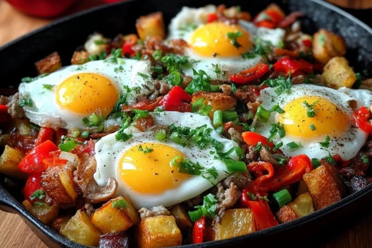 Un plat convivial et généreux composé de pommes de terre croustillantes, légumes fondants, œufs au plat et viande savoureuse, pour un petit déjeuner complet et gourmand à la française.