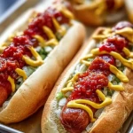 Déposez les saucisses bien chaudes dans chaque pain. Ajoutez une généreuse cuillère d’oignon émincé, quelques rondelles de cornichon, puis nappez de ketchup et de moutarde. Terminez par une touche de relish ou de confit d’oignon si désiré.