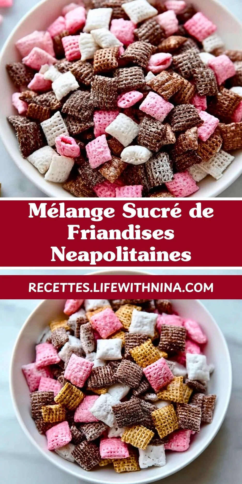 Ce mélange sucré, croquant et festif est inspiré des couleurs et saveurs napolitaines : chocolat, fraise et vanille. Idéal pour les fêtes, buffets ou petits cadeaux gourmands, il se prépare rapidement et ravira petits et grands !