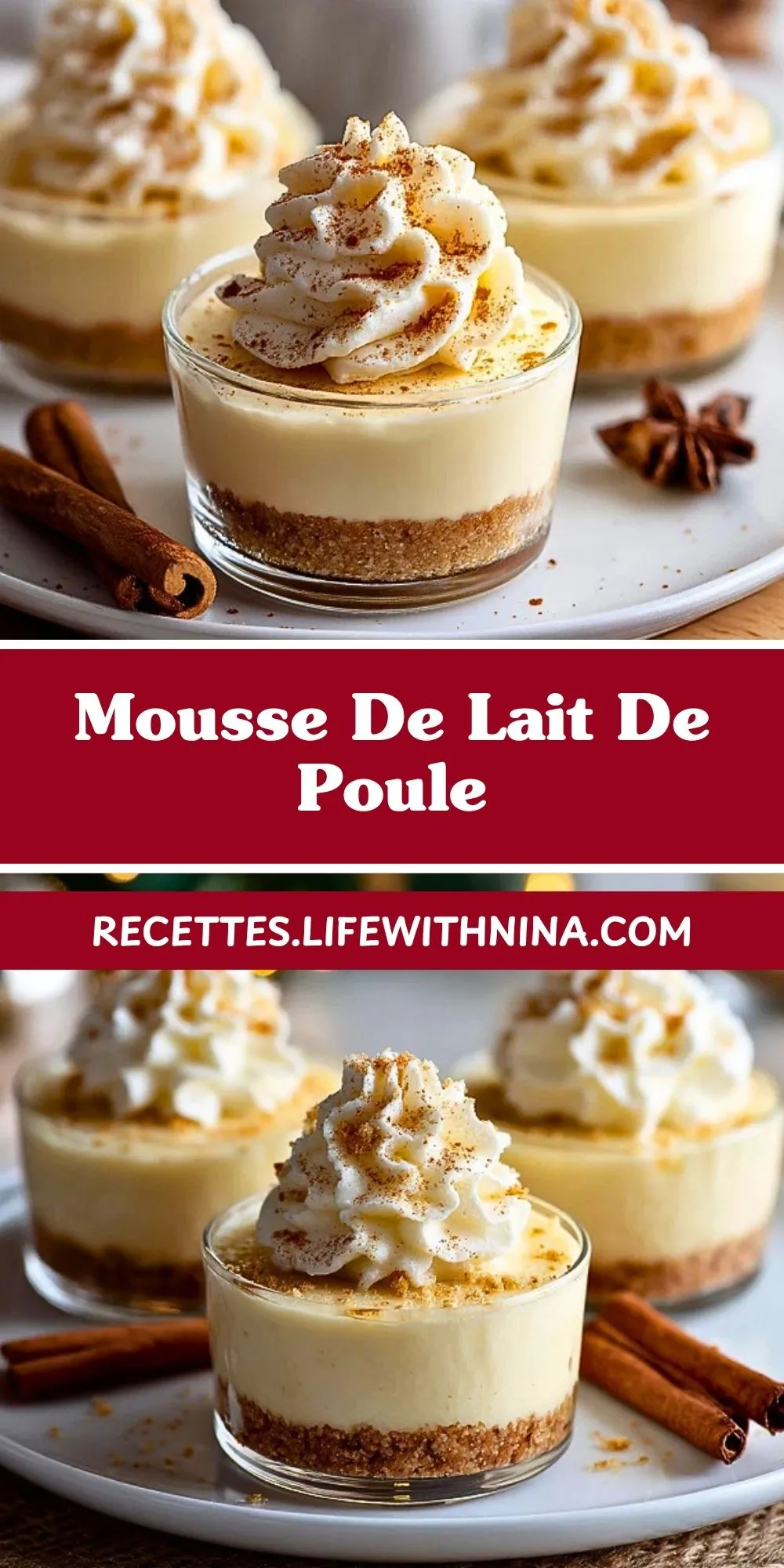 Une mousse de lait de poule légère, onctueuse et délicatement épicée, servie en verrines avec une base biscuitée croustillante et une touche de chantilly. C’est un dessert frais, élégant et facile à préparer à l’avance pour les repas de fête ou les envies gourmandes d’hiver.