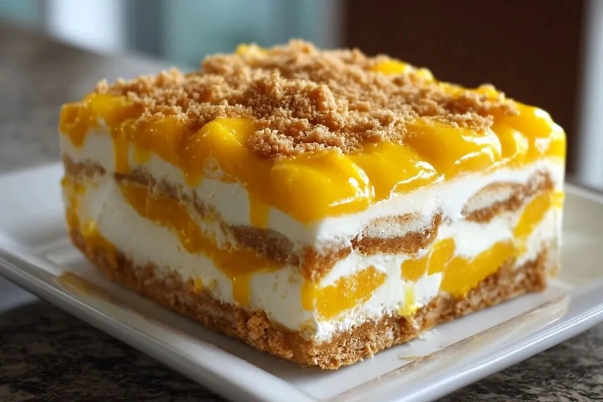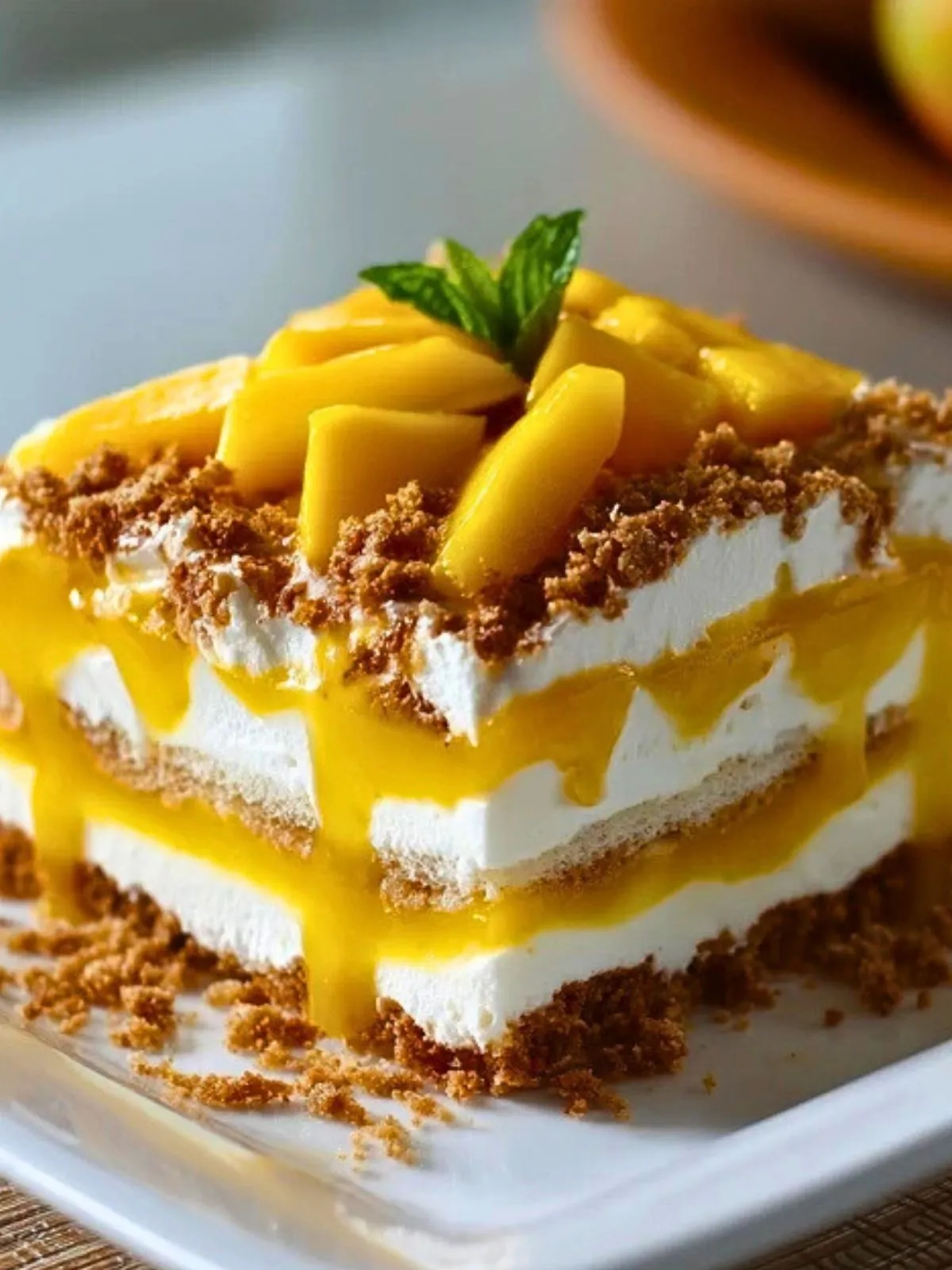 Dans cette version généreuse et gourmande, la mangue s’associe à une crème onctueuse et à une base biscuitée qui ajoute un contraste agréable. Le résultat est un dessert convivial, parfait pour les grandes tablées, les repas d’été, les fêtes de famille ou tout simplement pour se faire plaisir avec une douceur fruitée.