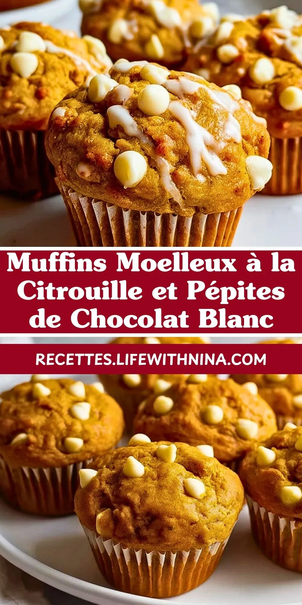 Des muffins ultra-moelleux à la citrouille, délicatement épicés, parsemés de pépites de chocolat blanc. Parfaits pour le goûter, le petit-déjeuner ou un brunch automnal.