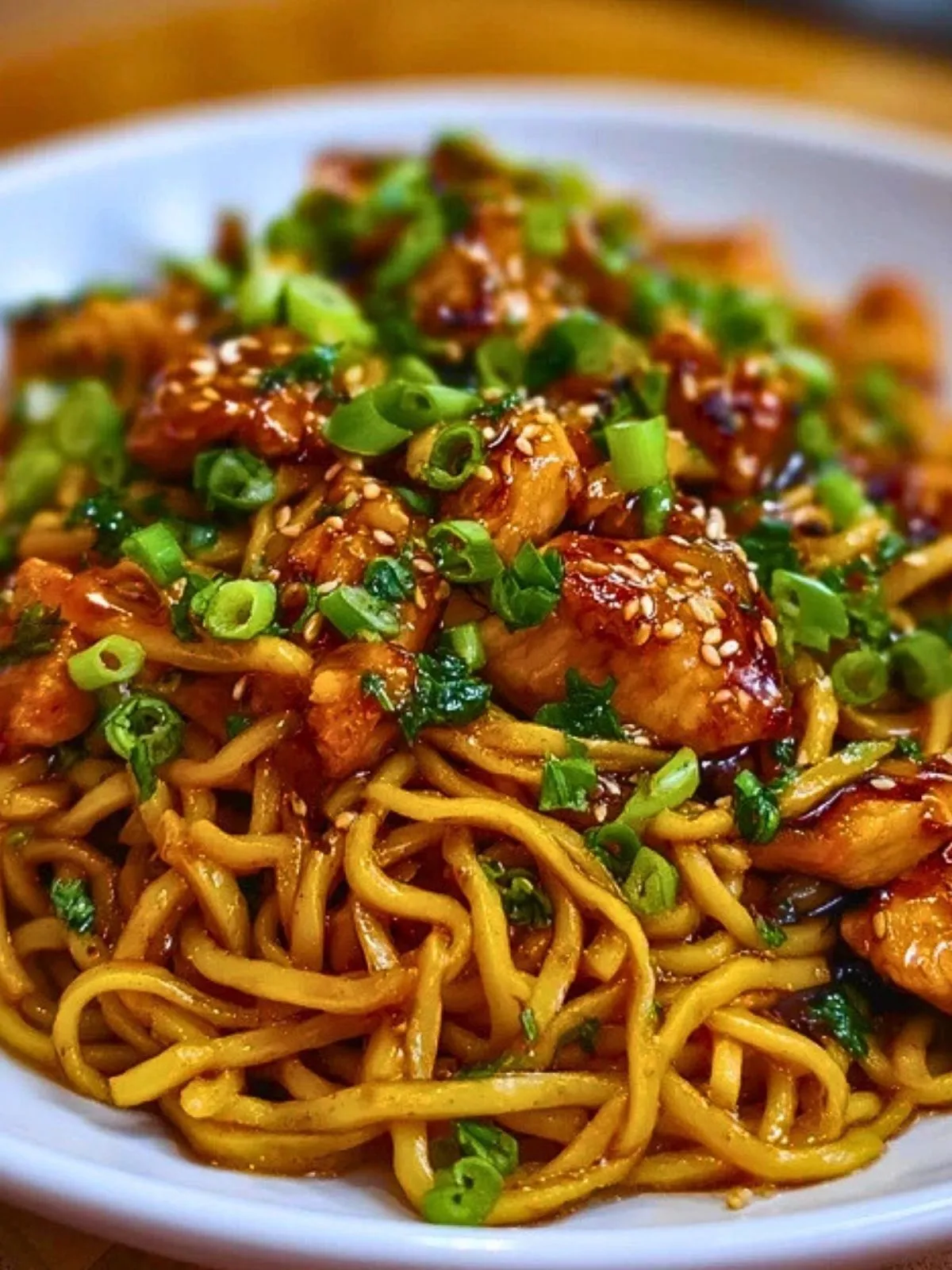 Servez les nouilles immédiatement pour profiter de leur texture brillante et moelleuse. Un bol de nouilles au poulet ail collantes se suffit à lui-même, mais vous pouvez aussi l’accompagner de légumes sautés ou d’une petite salade de chou pour plus de fraîcheur. Les restes se conservent 2 jours au réfrigérateur et se réchauffent à la poêle avec un filet d’eau ou de sauce soja.