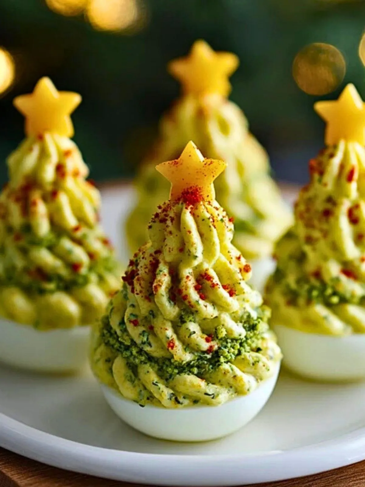 Des œufs mimosa revisités en mini sapins de Noël : une base onctueuse d’avocat et de jaune d’œuf, joliment dressée sur des blancs, puis décorée de baies, herbes et petites étoiles de légumes. Parfaits pour un apéritif festif et bluffant !