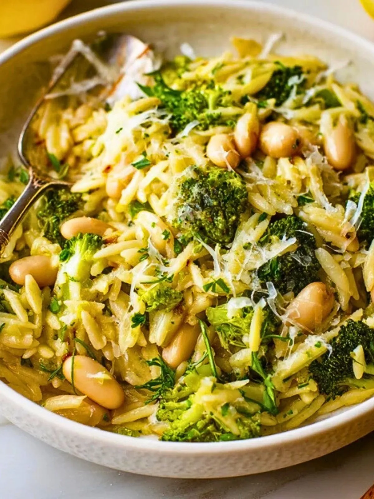 Keywords: orzo brocolis haricots blancs citron parmesan plat végétarien facile