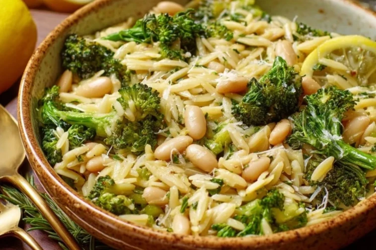 Un grand bol d’orzo crémeux, des fleurettes de brocoli légèrement rôties, des haricots blancs fondants et un parfum de citron frais… ce plat a tout du dîner réconfortant prêt en peu de temps, mais avec une vraie touche de cuisine maison.