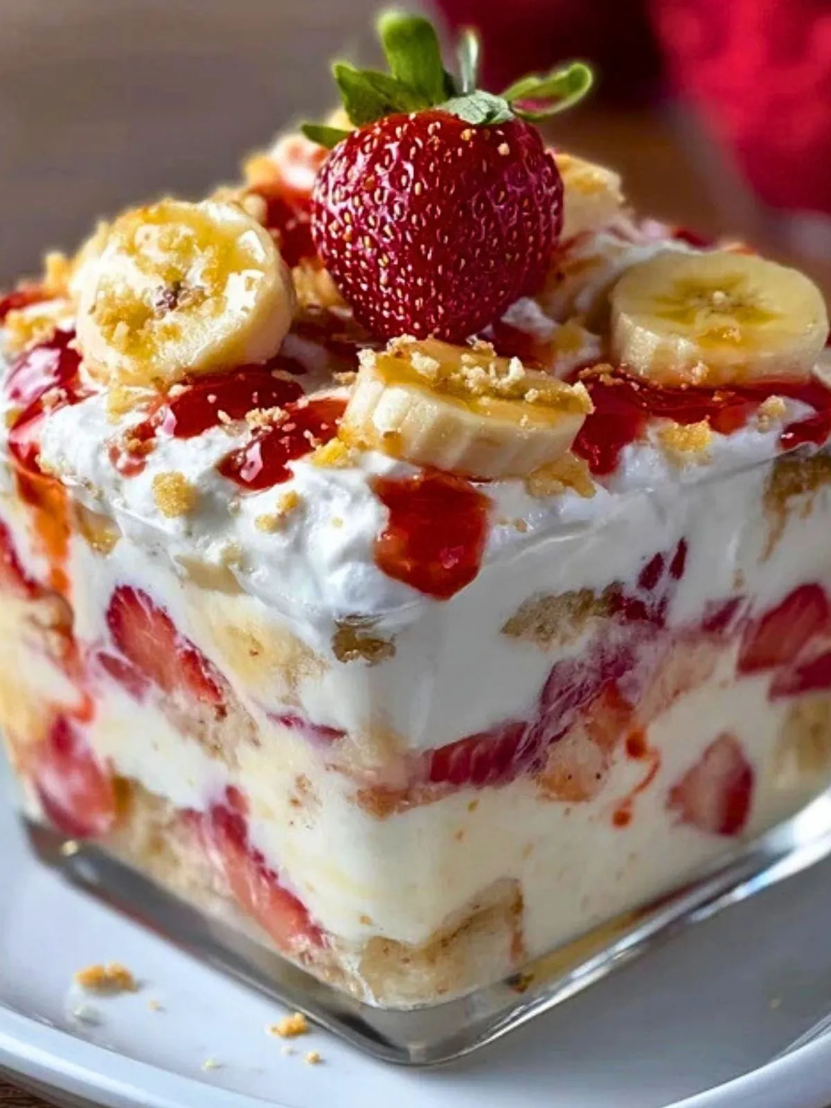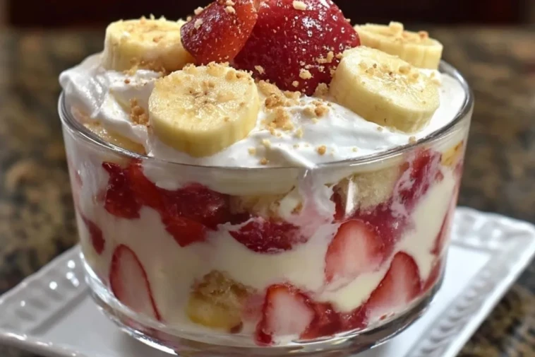 Ce parfait aux fraises et bananes est un dessert frais, onctueux et facile à préparer, idéal pour les beaux jours. Entre les couches de crème vanillée, les morceaux de fraises juteuses, les rondelles de banane fondantes et les biscuits moelleux, il offre un bel équilibre de textures et de saveurs dans une présentation aussi simple qu’élégante.